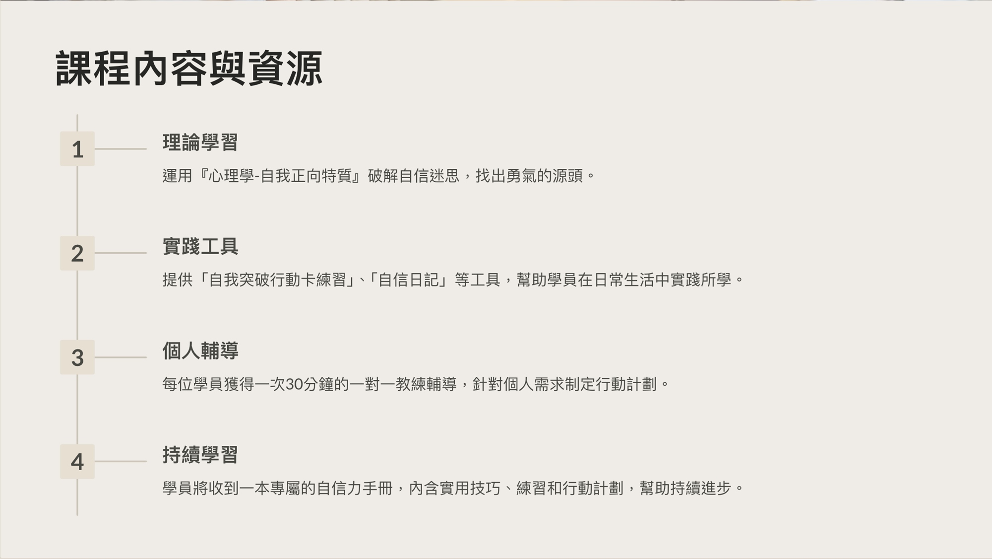 課程提供簡單有效的實踐工具,如「正向特質卡」、「自我突破行動卡練習」、「自信日記」與「自信儀式」,幫助學員將學習融入日常生活。