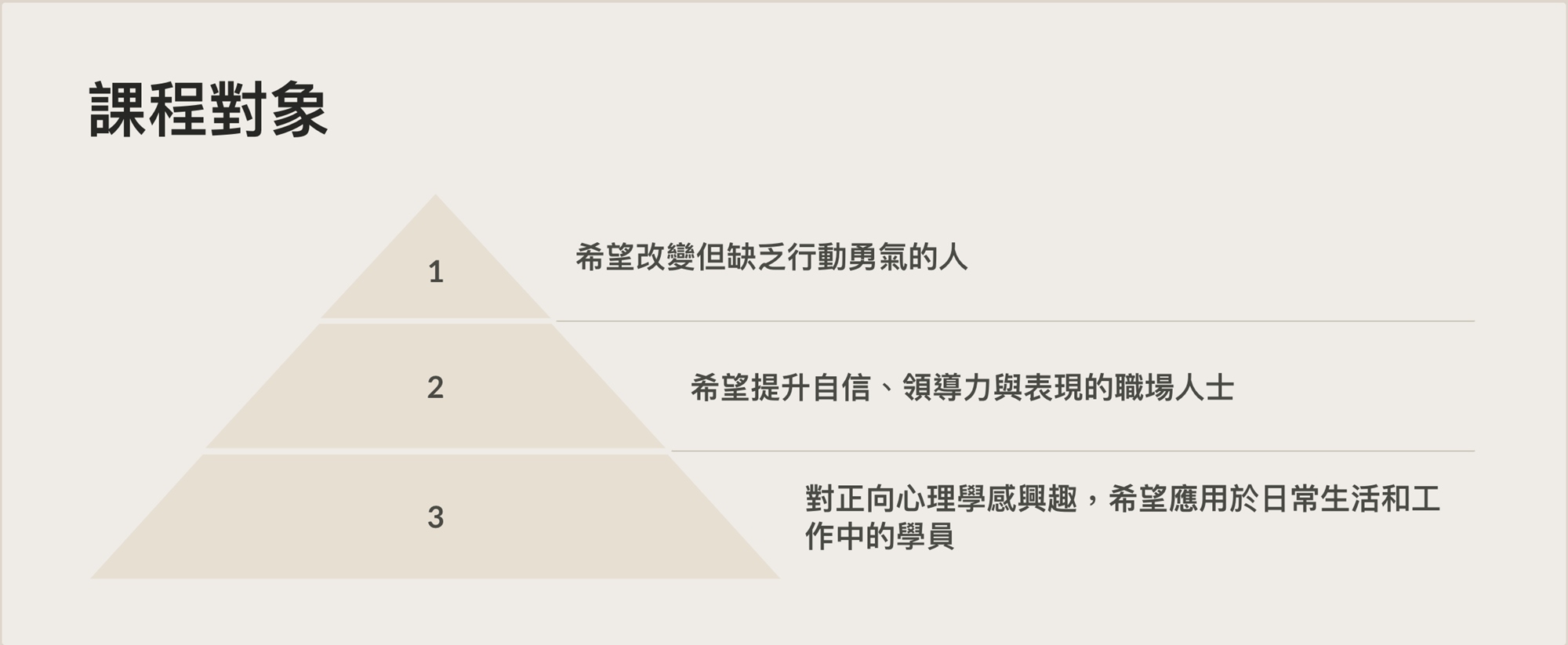 課程結合正向心理學與職場實踐,分享具體的操作方法幫助學員在工作中提升表現與滿足感。
