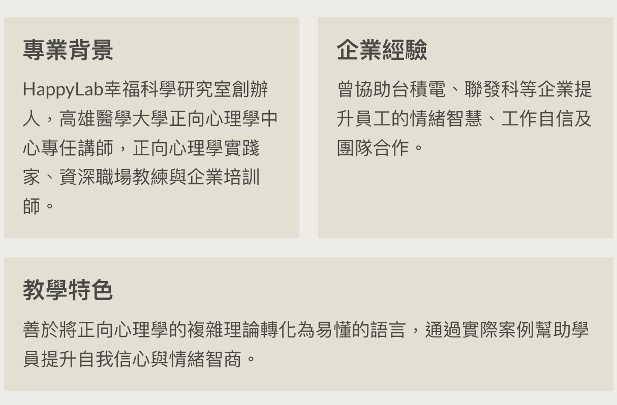 - 高雄醫學大學正向心理學中心專任講師:專注於將正向心理學理論與實踐結合,幫助學員在生活中應用科學原則,提升自我效能與情緒調節能力。