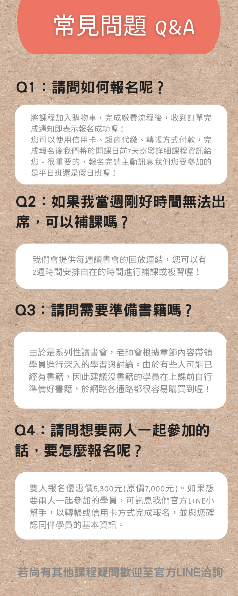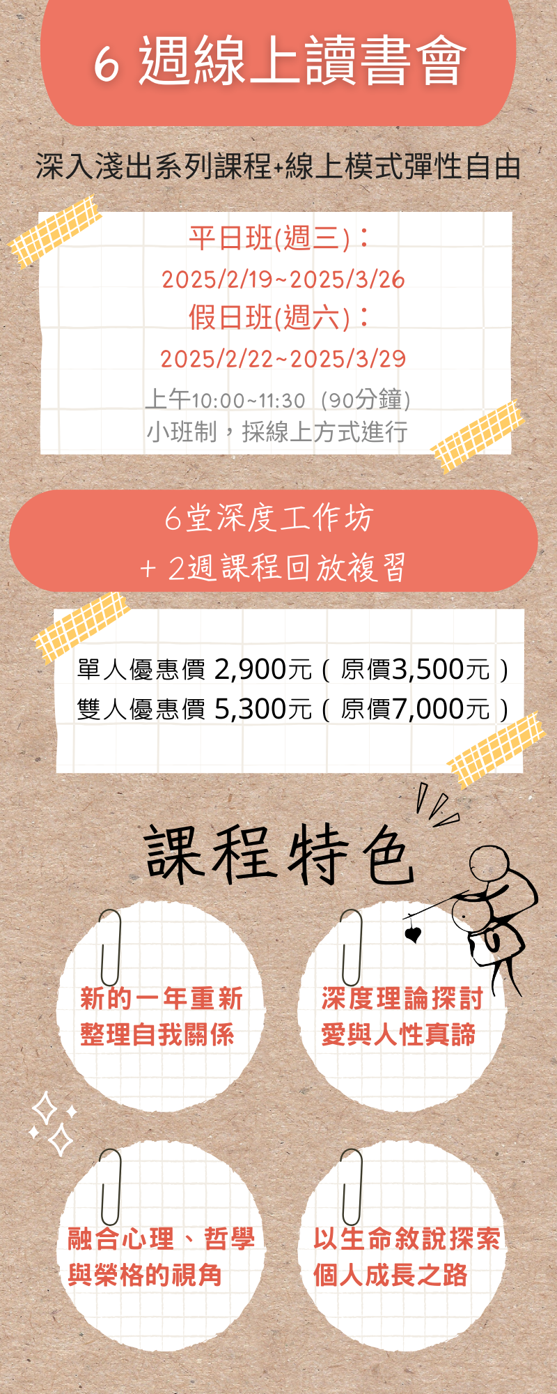 - 讀書會時間(平日班-週三):2/19, 2/26, 3/5, 3/12, 3/19, 3/26
