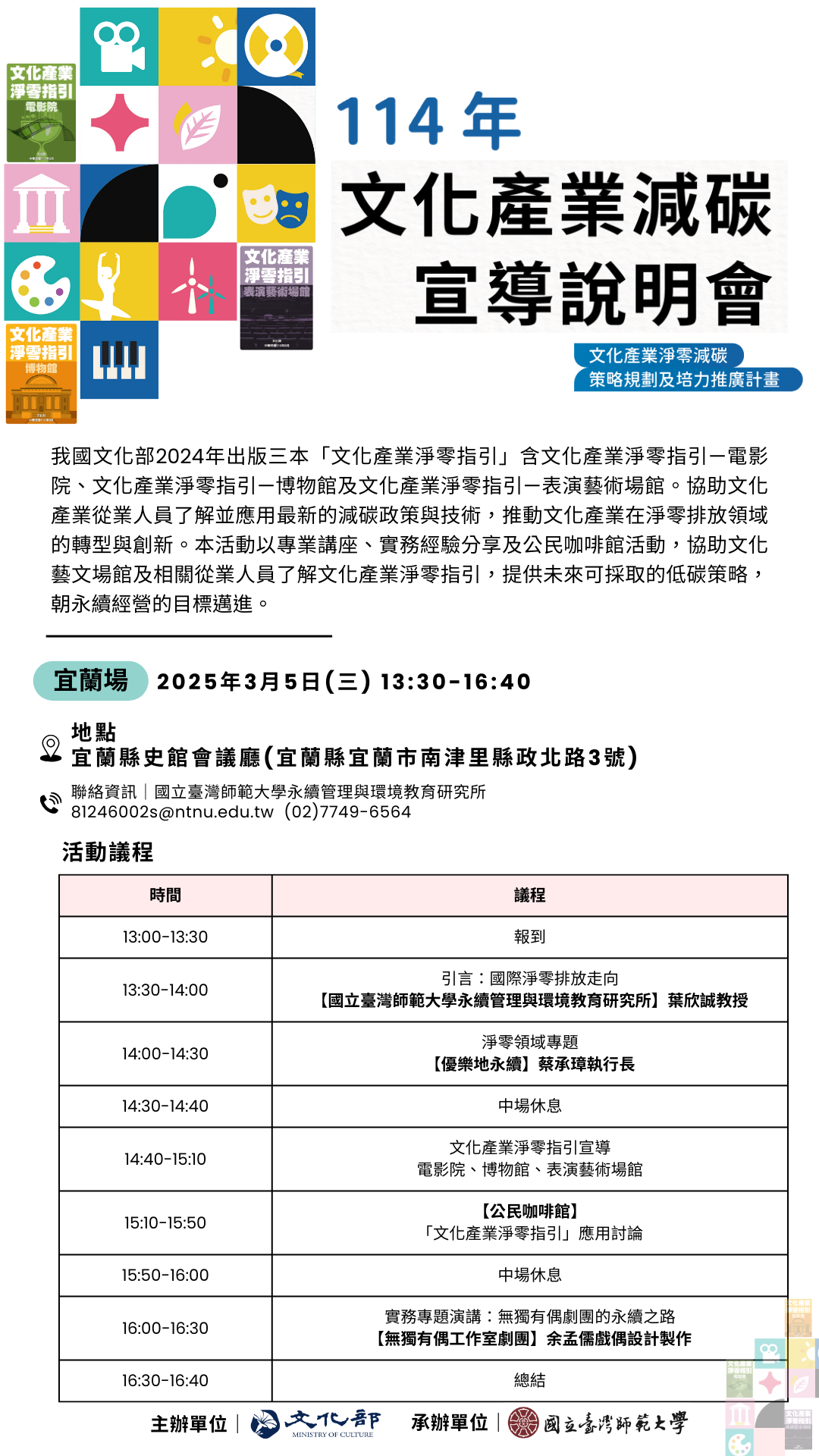 - 活動名稱:114 年文化產業減碳宣導說明會