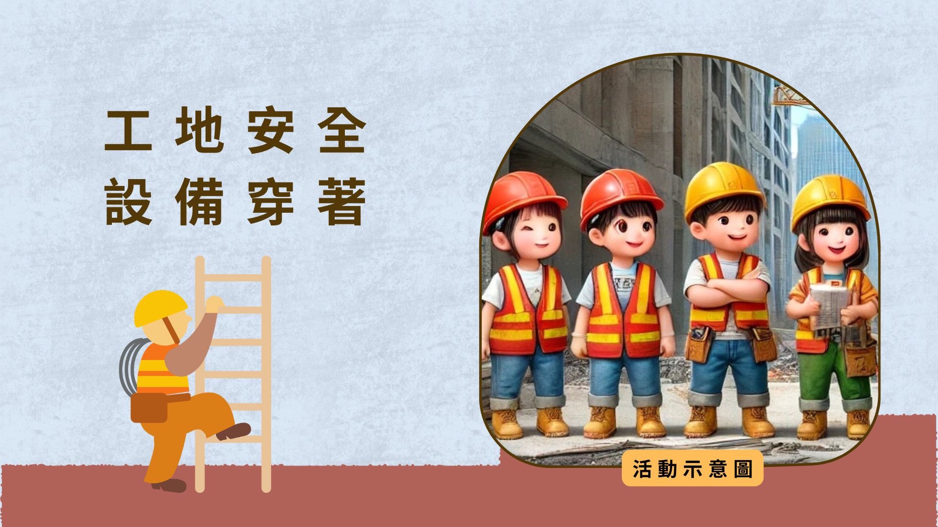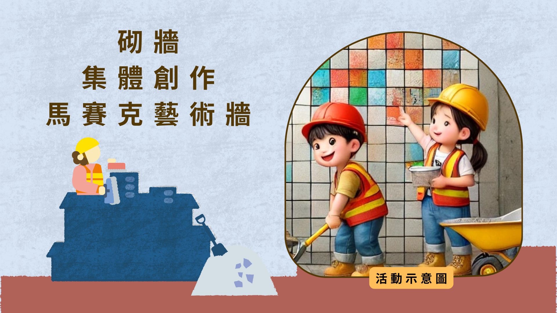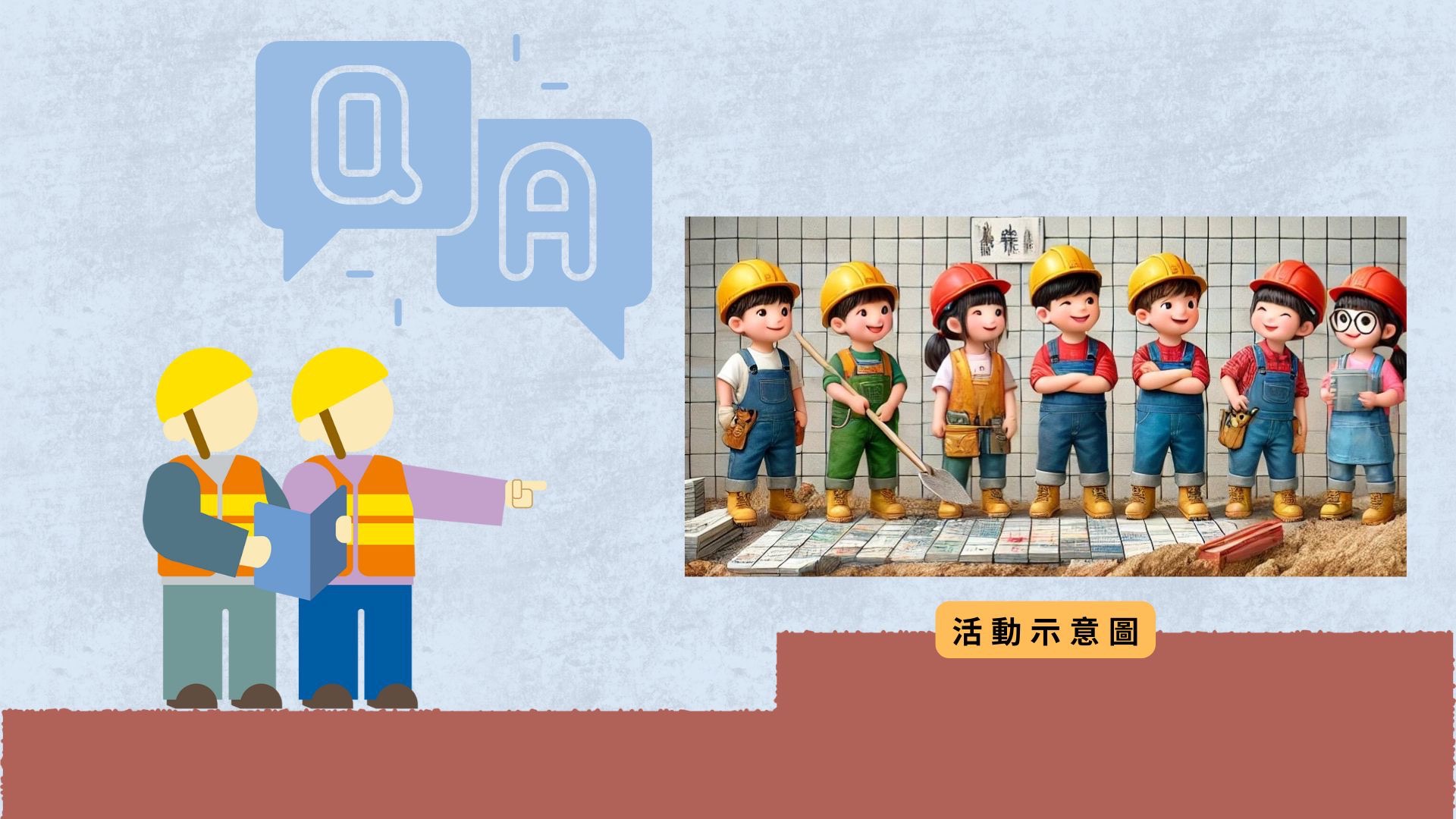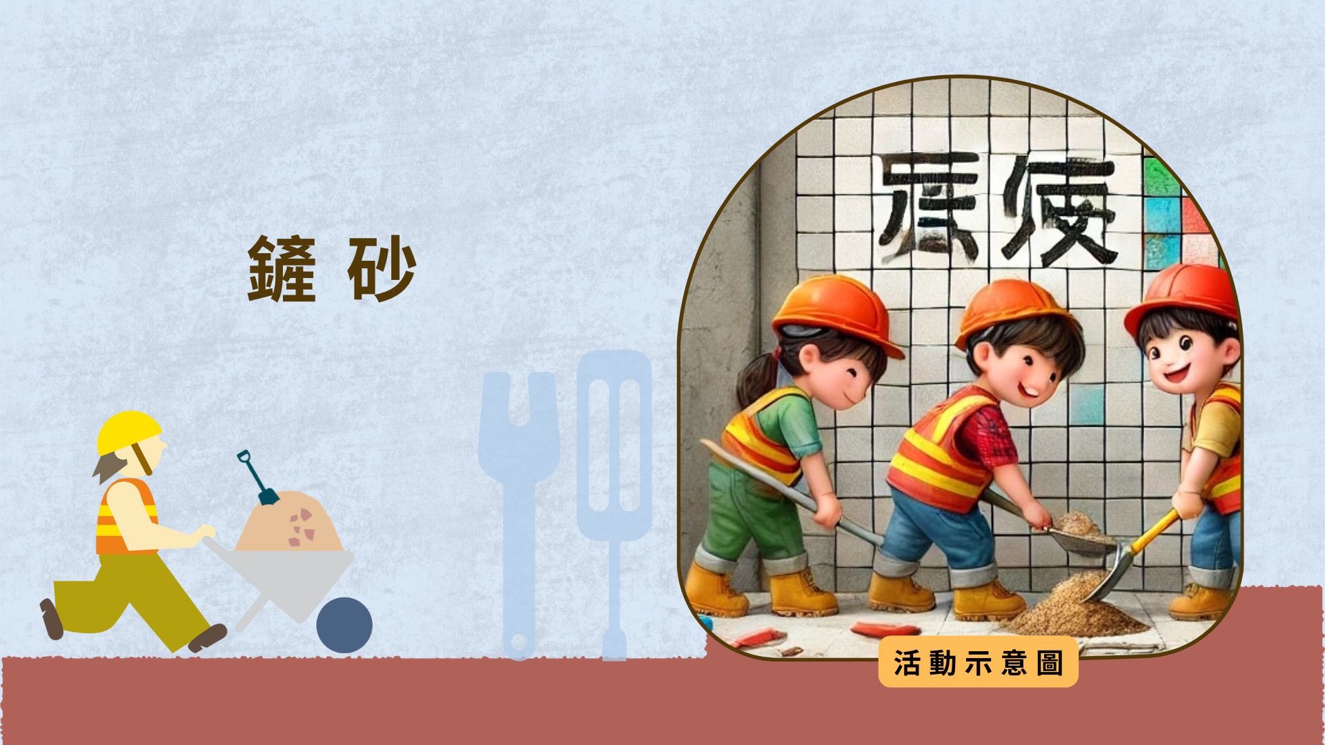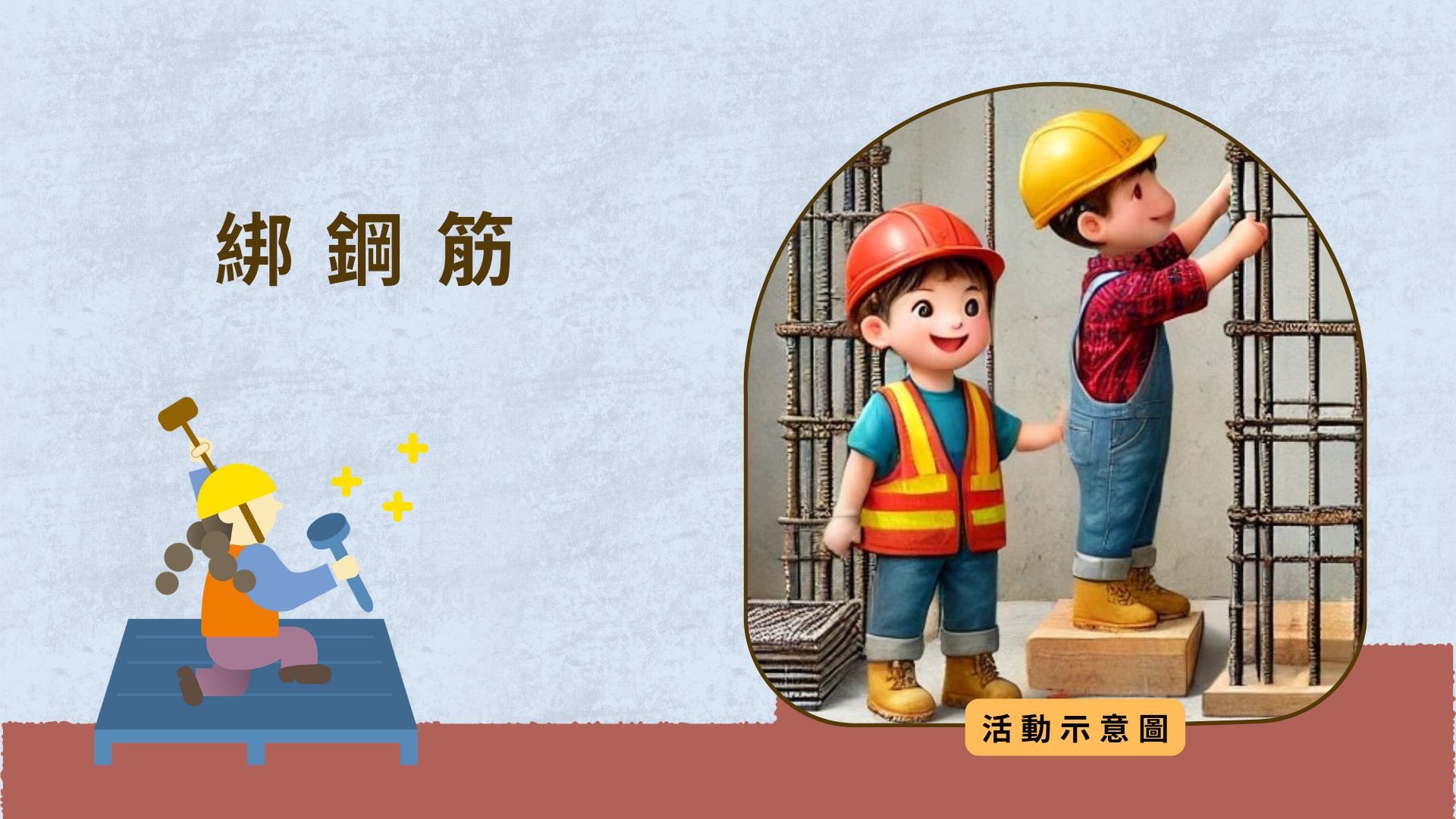 提供工地道具,讓學童體驗工地安全設備穿著、綁鋼筋、鏟砂、砌牆等遊戲,模擬耐震補強的流程,
