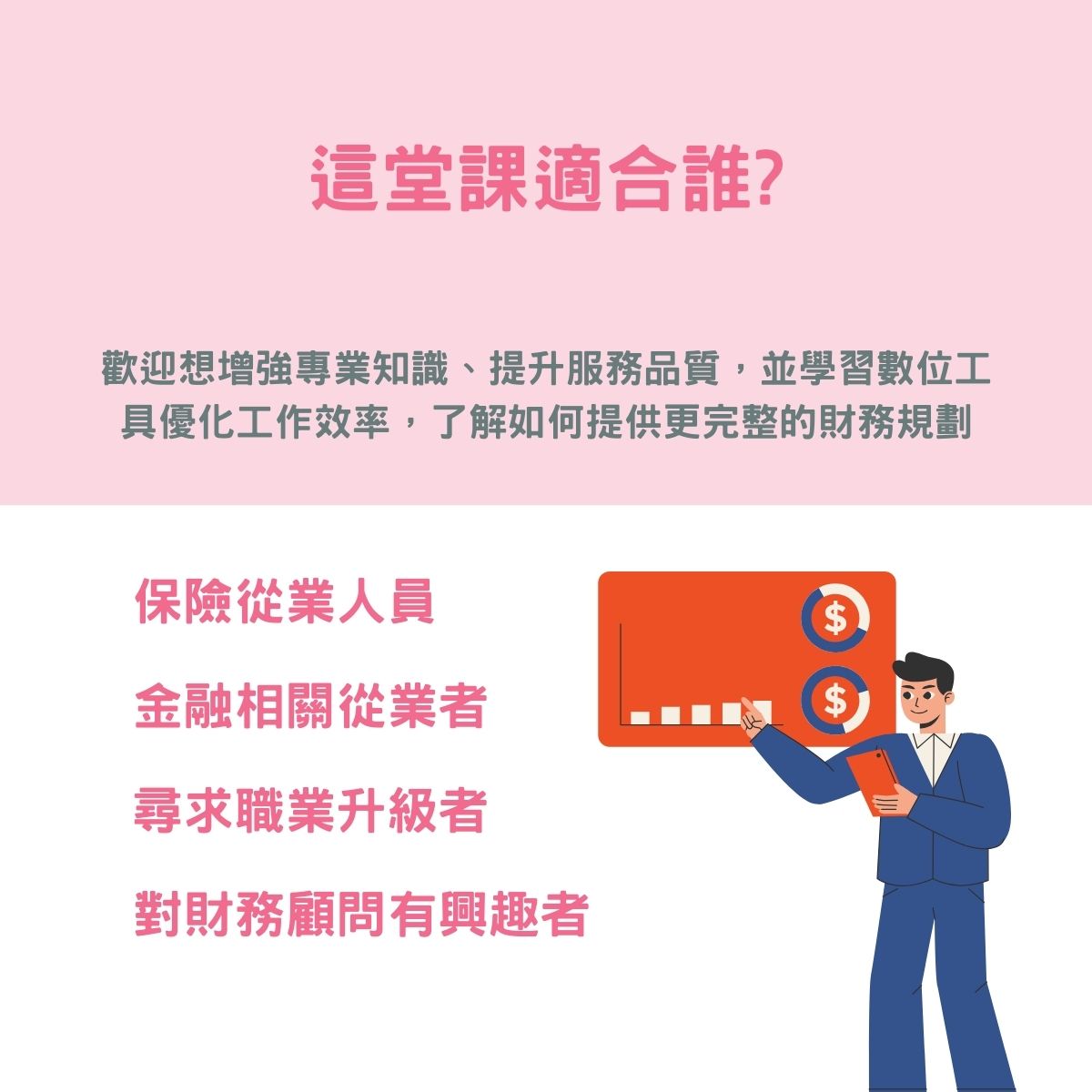 不論你是正在尋找新方向的保險人,還是想提升競爭力的投信、房地產規劃師,本課程將成為你的職涯轉折點!