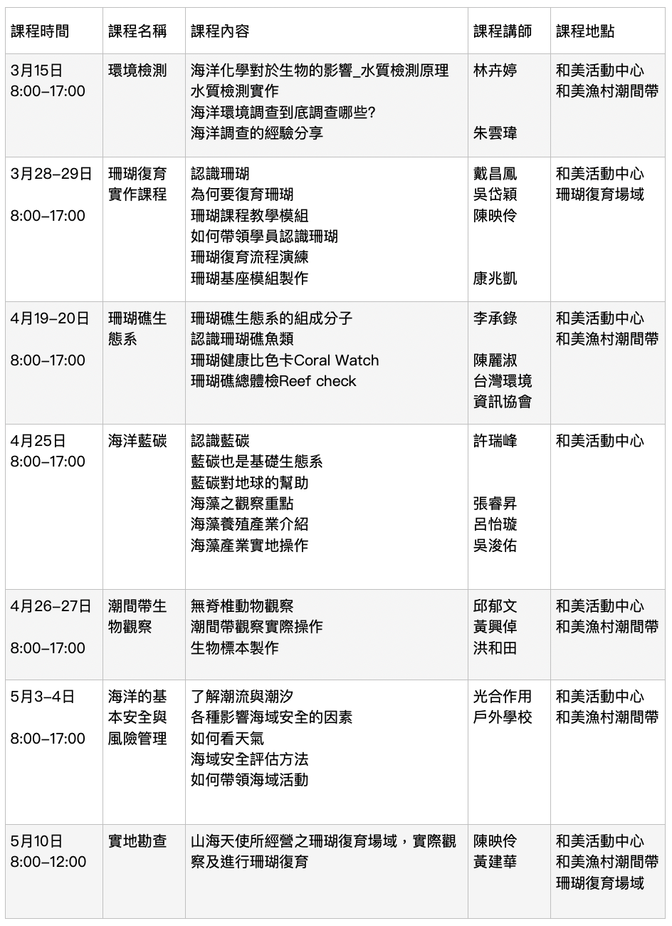 今年的課程匯聚堅強師資,涵蓋珊瑚復育實作、海洋安全、環境檢測與探險實踐,帶領參與者從珊瑚大小形態到海洋議題的深入分析,啟發對海洋保育的熱情,讓更多人了解珊瑚的重要性與海洋的未來。誠邀您加入我們,共同守護海洋的生命之源!!