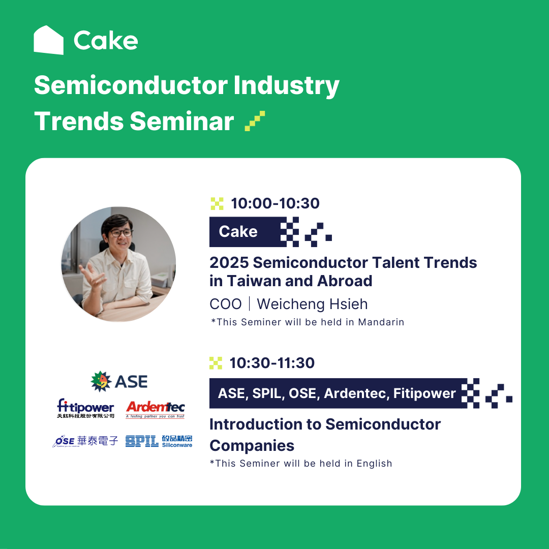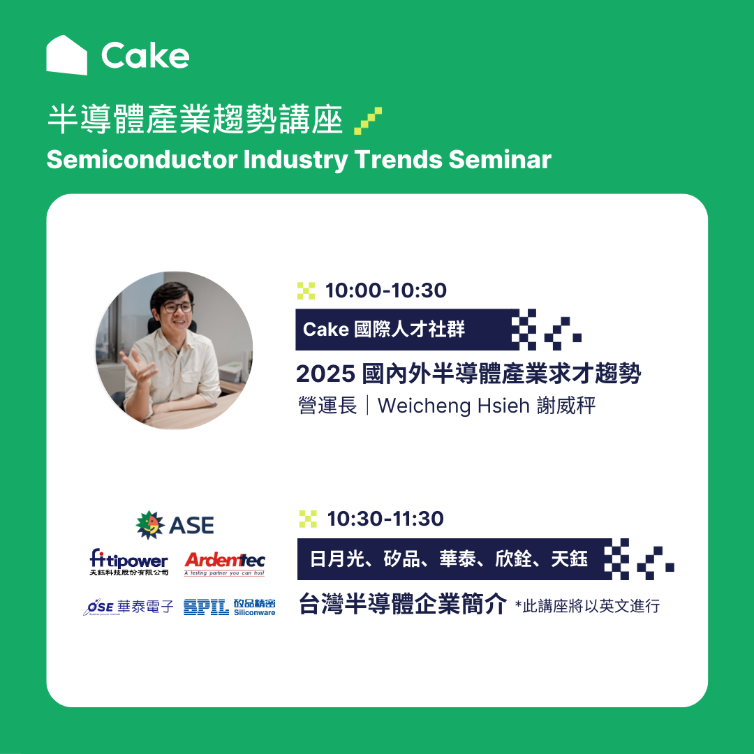 10:30-14:00 TAIWAN PURITIC CORP Piping Engineer | 10:00-10:30 【 Cake|Semiconductor Talent Trends in Taiwan and Abroad 】 | ||