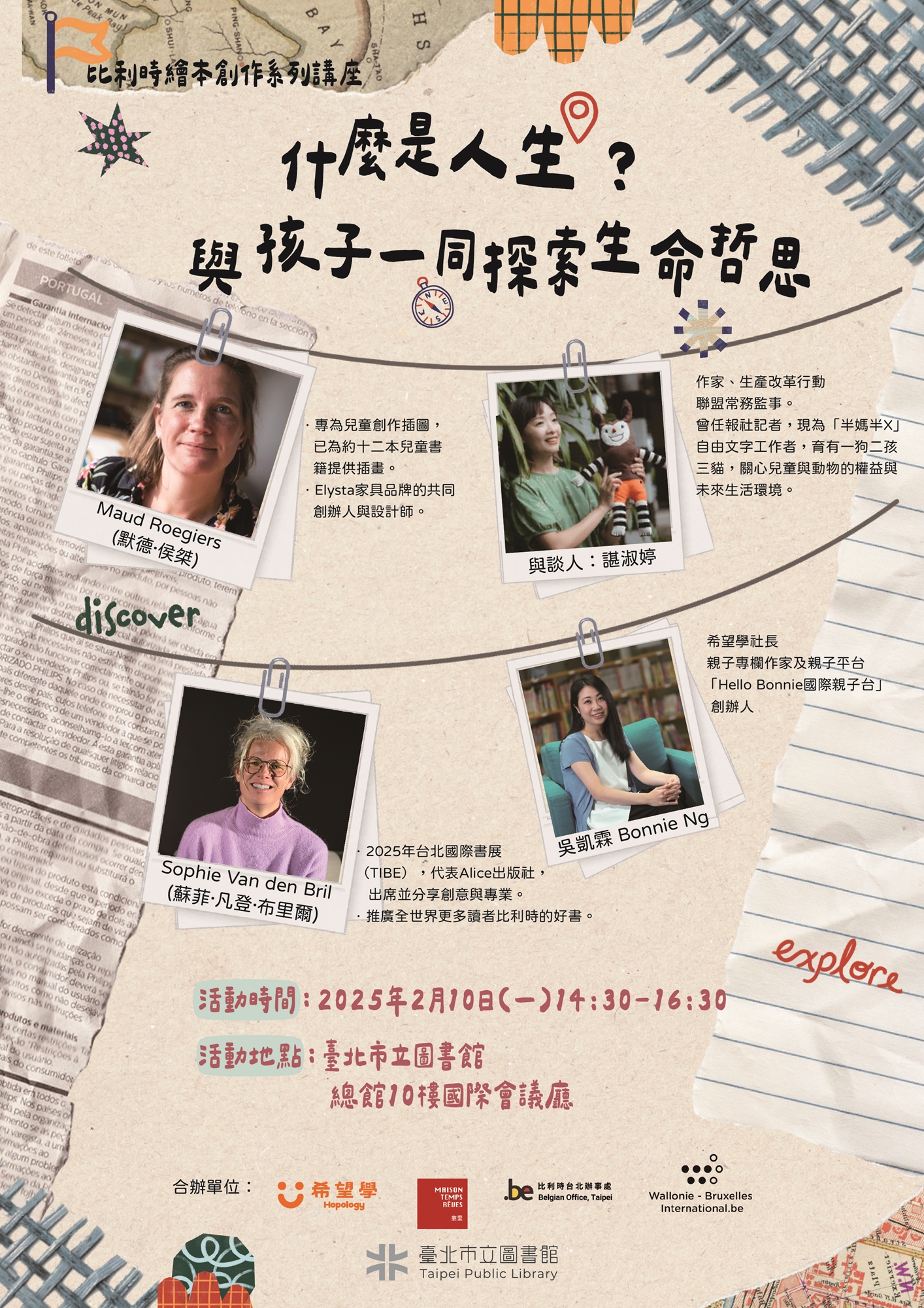 本次講座邀請到比利時繪本創作者 默德•侯桀(Maud Roegiers)、比利時Alice Edition出版社教育推廣負責人 蘇菲•凡登•布里爾(Sophie Van den Bril)、台灣作家、生產改革行動聯盟常務監事 諶淑婷,以及希望學社長暨Hello Bonnie國際親子台創辦人 吳凱霖,共同探討如何透過繪本引導孩子認識生命中的多樣面貌與深刻哲思。