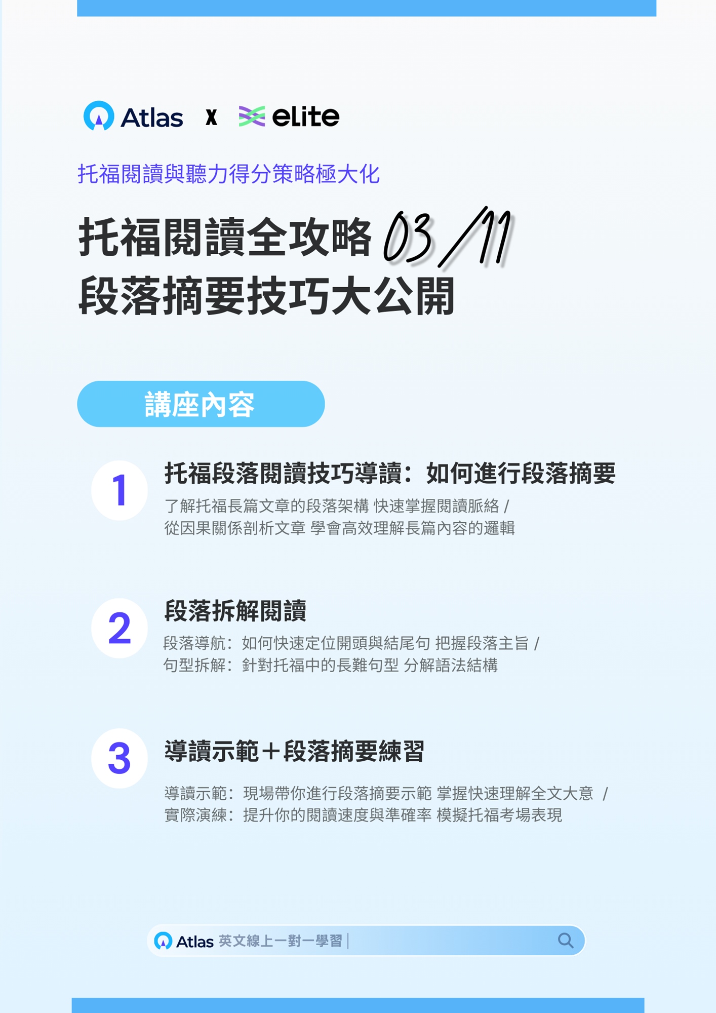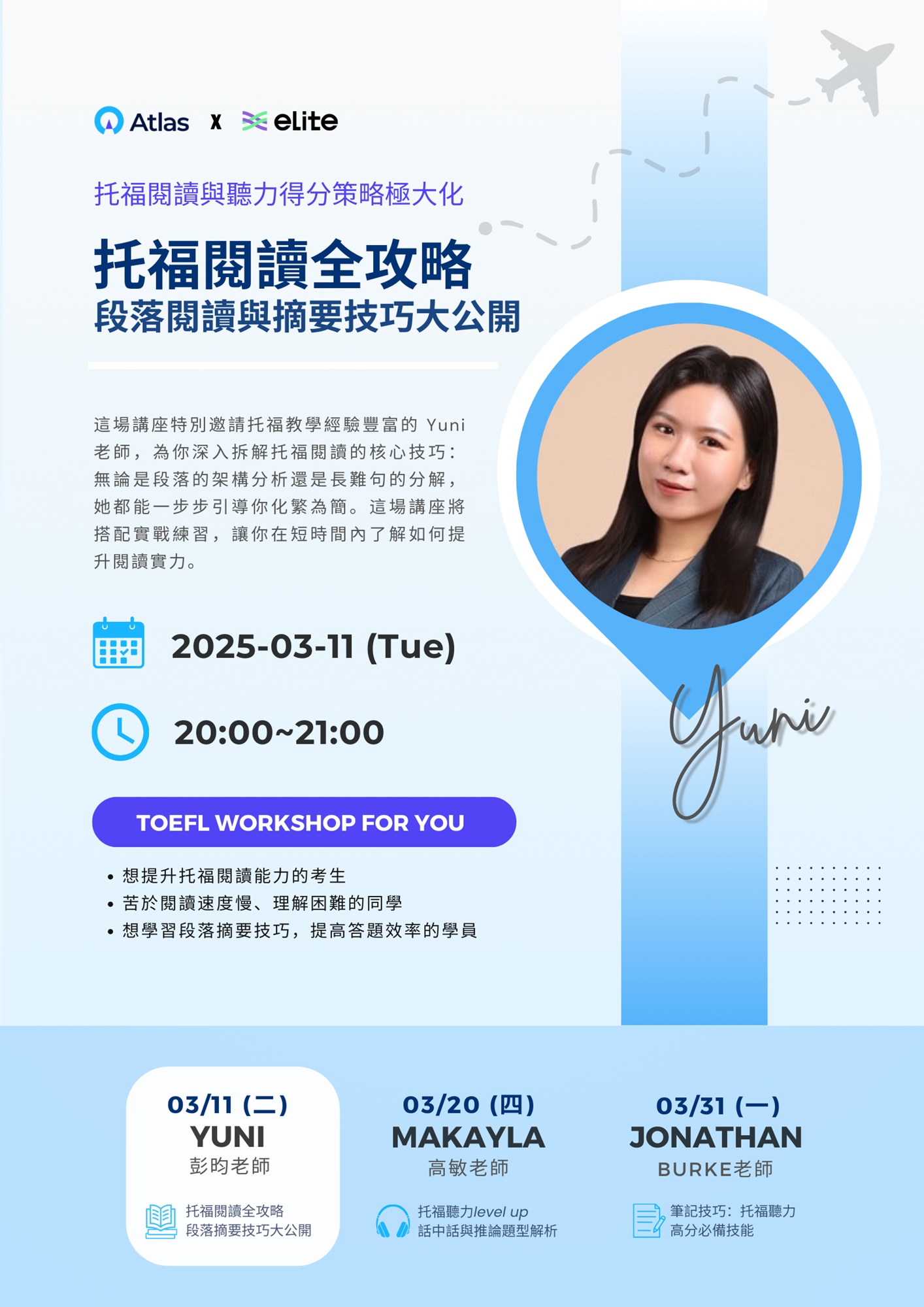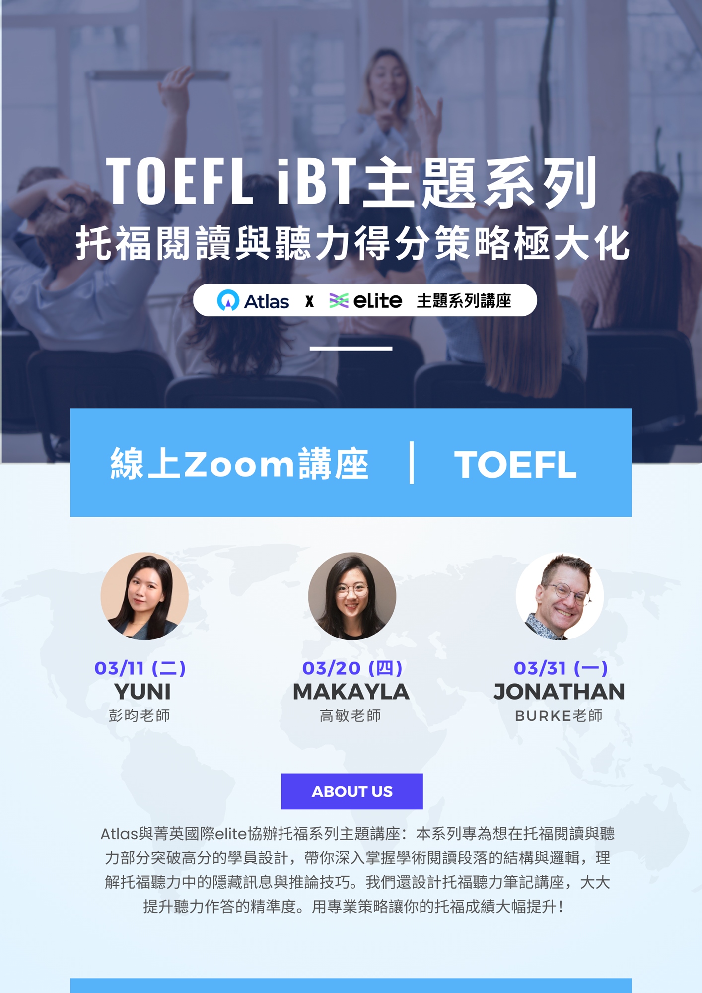 托福講座主題與三大場次資訊 – Atlas x Elite