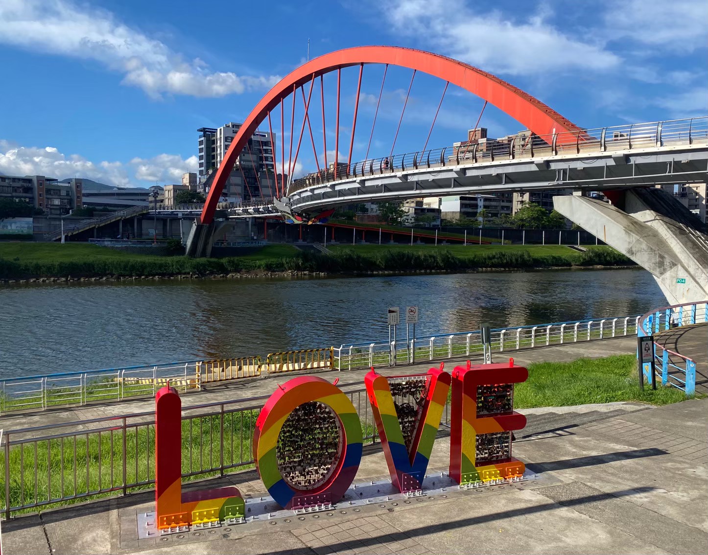 📢橫跨在基隆河上的彩虹橋,是此區的觀光新地標,由橋下往上看去,好像是一條潛伏在水裡的龍,站在橋上可以欣賞美麗的水岸景觀,不僅適合悠閒散步,也可以騎著單車沿著河濱車道穿梭,享受難得的河岸氣氛,而夜晚的燈影投射,更為此處增添不少浪漫的情懷,一旁的「心有鎖屬」,是男女雙方彼此鎖住愛情最好的地方。