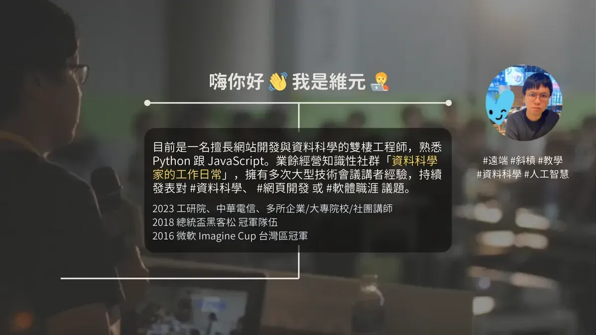 這堂課將由 資料科學家的工作日常 ❙ 維元 老師經營與授課 ▼