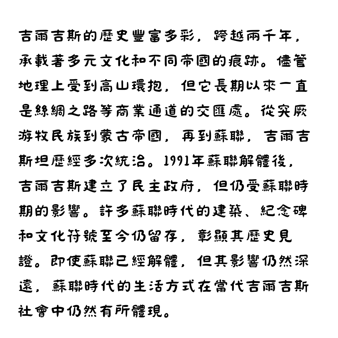 Kyrgyzstan boasts a rich and diverse history spanning over two millennia, bearing the traces of various cultures and empires. Despite its geographical isolation due to mountainous terrain, it has long served as a crossroads for commercial routes like the Silk Road. From Turkic nomadic tribes to the Mongol Empire and later the Soviet era, Kyrgyzstan has undergone multiple periods of rule. Following the dissolution of the Soviet Union in 1991, Kyrgyzstan established a democratic government, yet it continues to be influenced by its Soviet past. Many architectural landmarks, monuments, and cultural symbols from the Soviet era still stand today, serving as testament to its historical legacy. Even though the Soviet Union has collapsed, its influence remains profound, with remnants of Soviet-era lifestyles still evident in contemporary Kyrgyz society.
