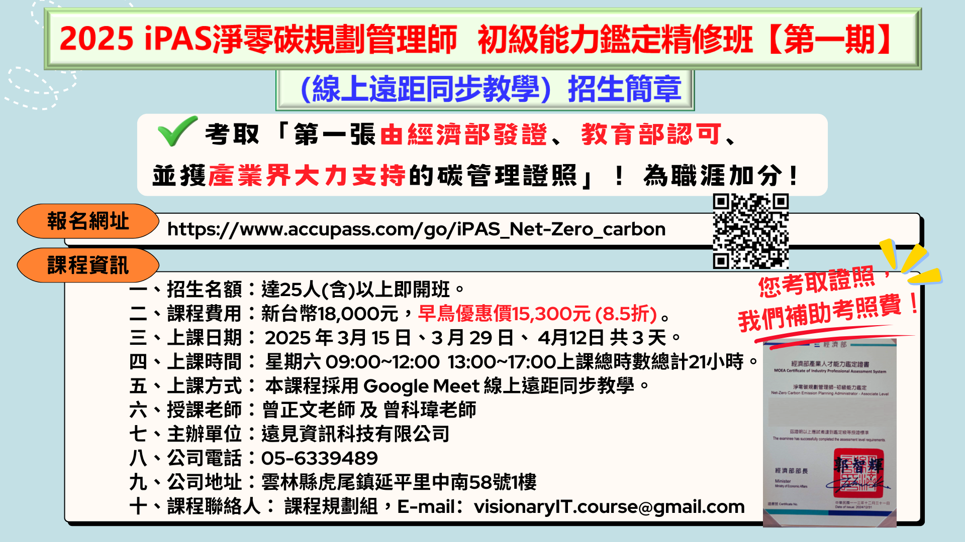 五、考取證照獎勵方案:只要全程完成本班課程,並於2025年度內考取「iPAS淨零碳規劃師初級」認證