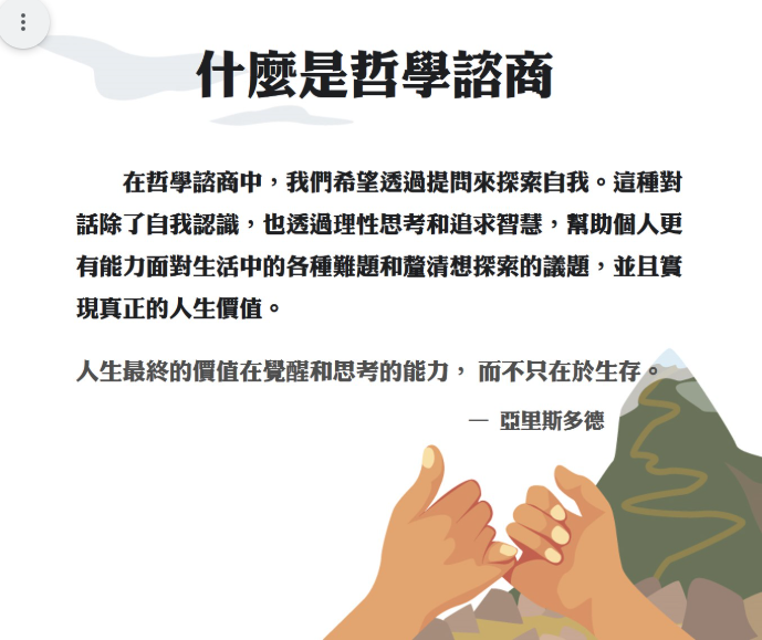 本次團隊為實習哲學諮商師,非醫事人員,並無提供心理諮商、心理治療或相關醫療行為。