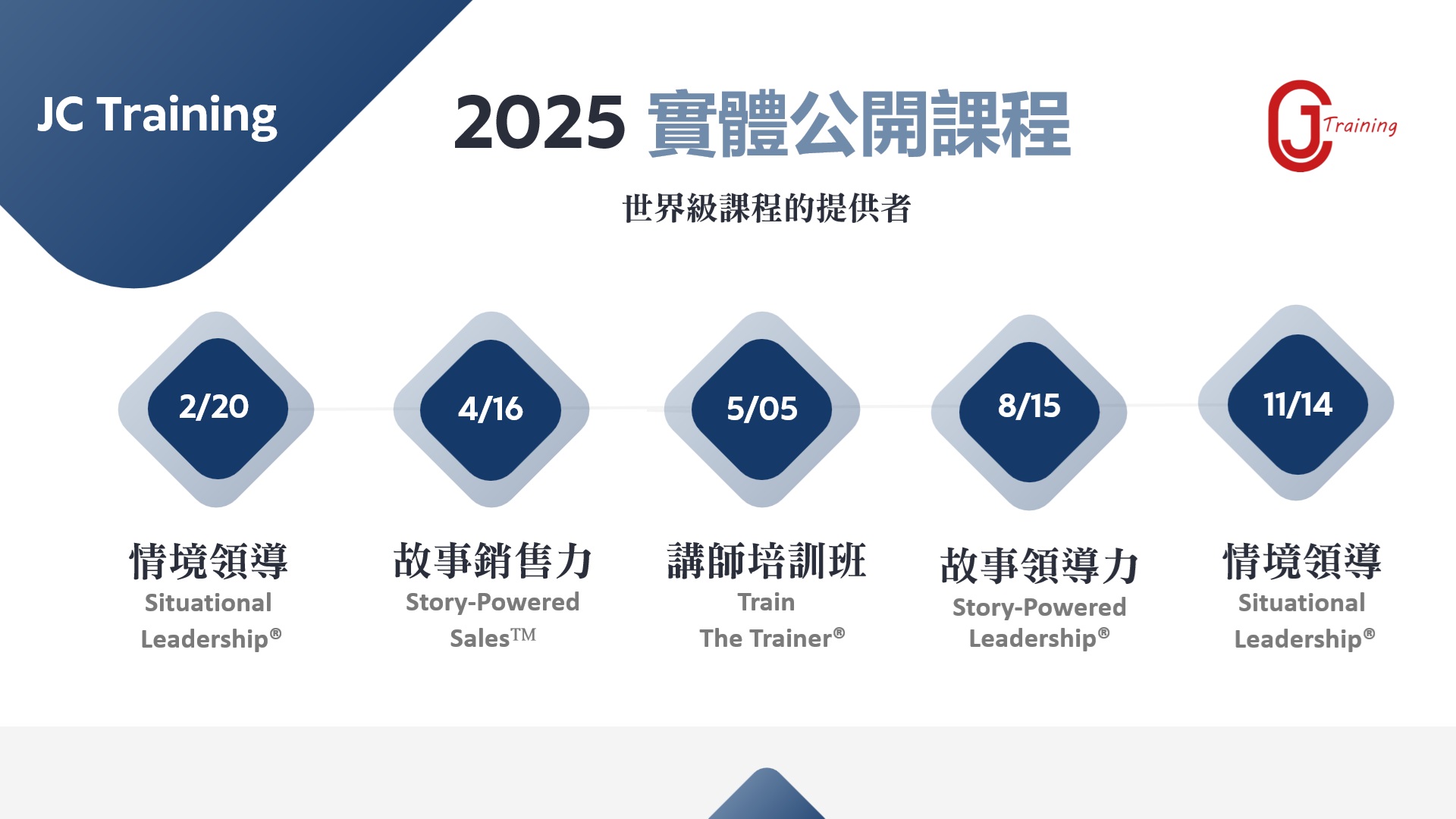 課程認證及精通的課程 : Fierce Conversation® 關鍵領導 、The Leadership Challenge® 模範領導、CLS 情境領導 Situational Leadership® 、Marshall Goldsmith Stakeholder Centered Coaching (馬歇爾. 葛史密斯MGSCC® 高管教練)。
