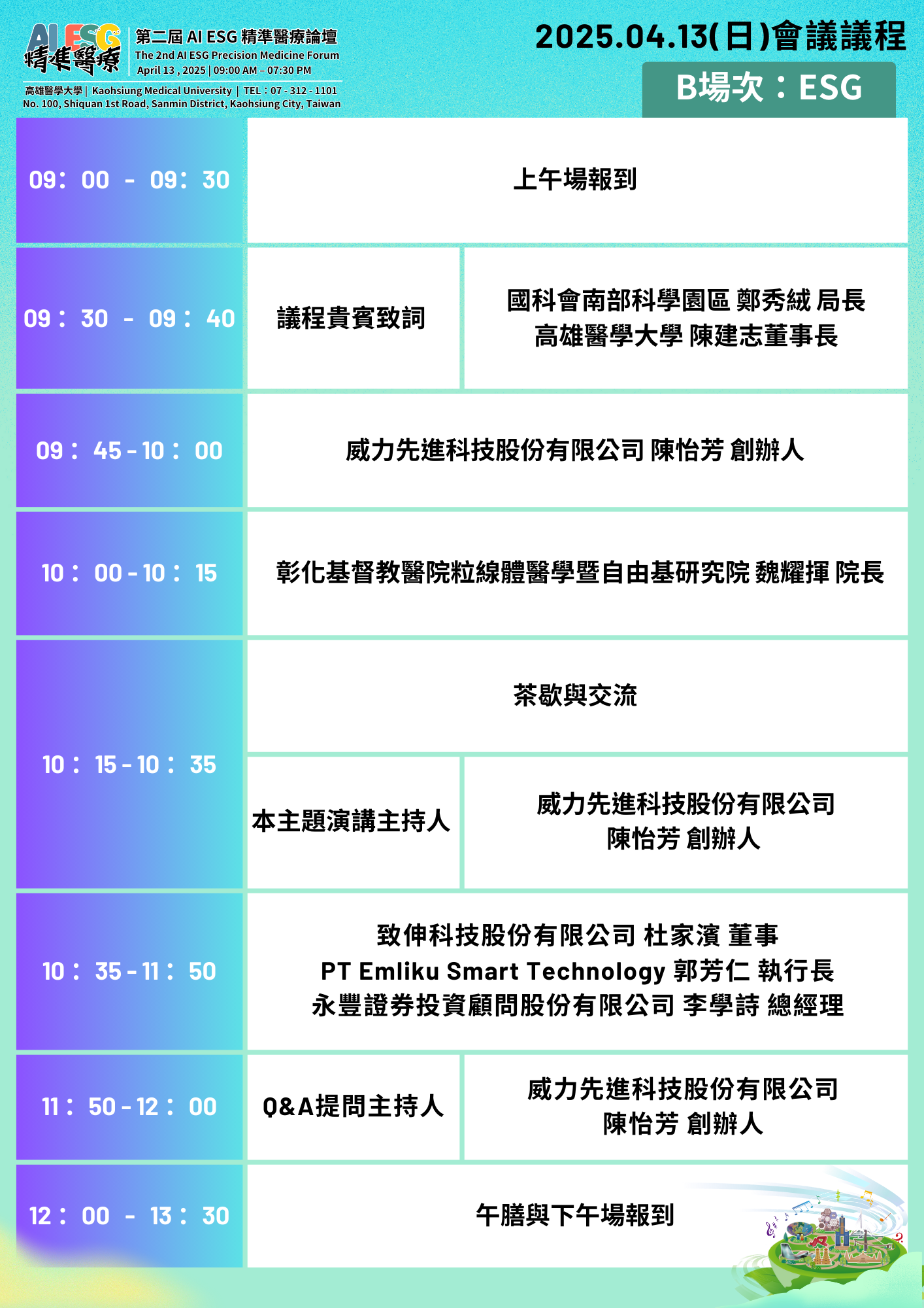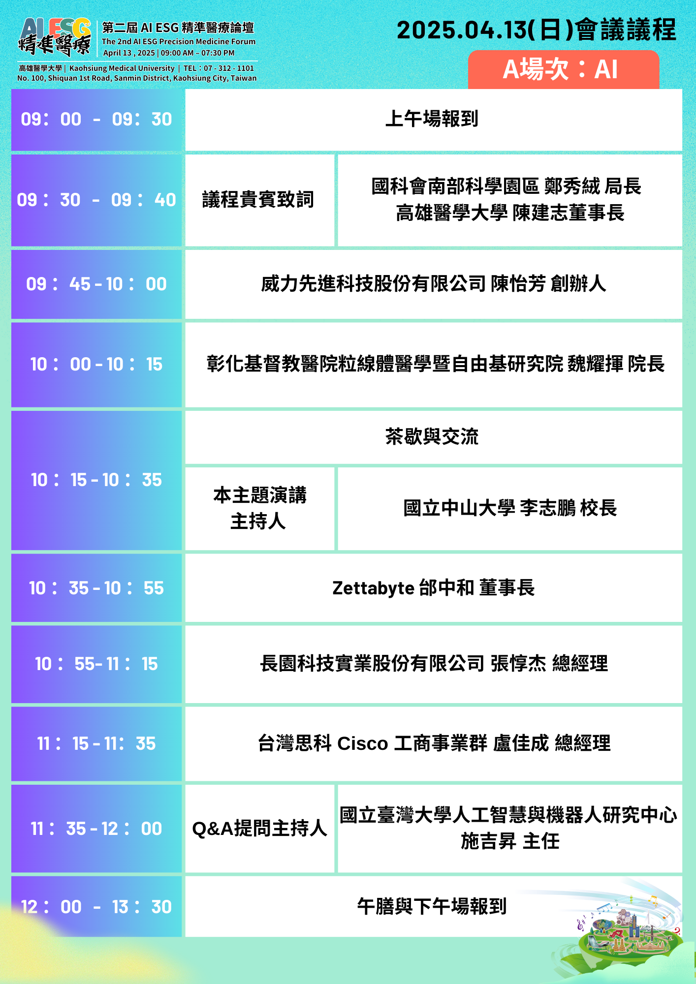 協辦單位 |國立台灣大學、國立陽明交通大學、國立中山大學、國家科學及技術委員會南部科學園區管理局、國立台灣大學人工智慧與機器人研究中心、社團法人高雄市醫師公會、精準健康聯盟、AI 產業新創大同盟、醫療系統聯盟Healthcare Systems Consortium - HSC、台灣印尼科技與永續經營協會、美東台美產業科技協會、法德利科技股份有限公司、花蓮慈濟、威力先進科技、高雄市立高雄女子高級中學、金屬工業研究發展中心