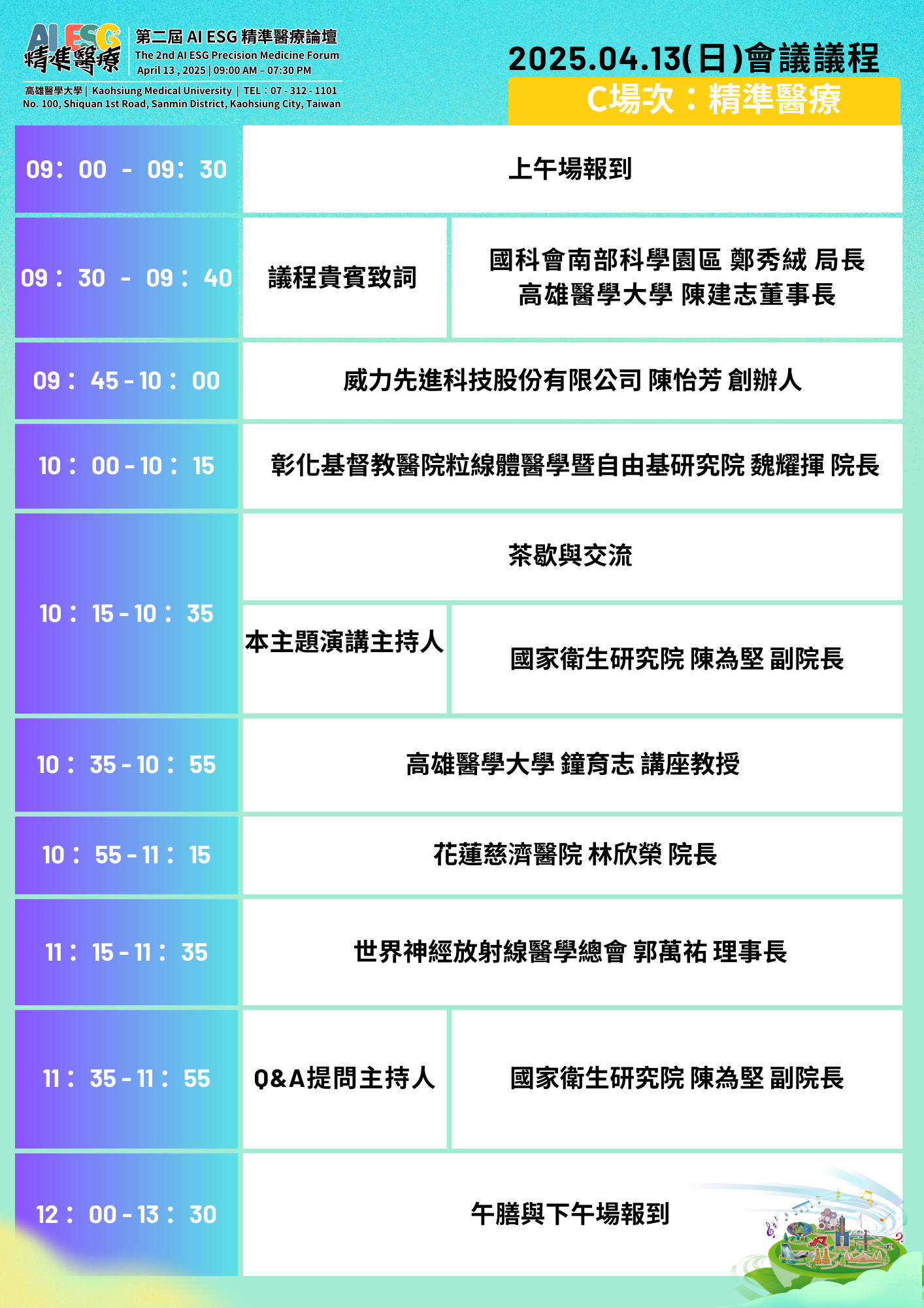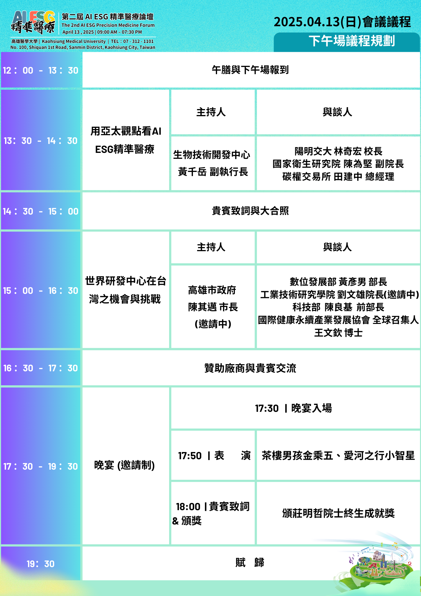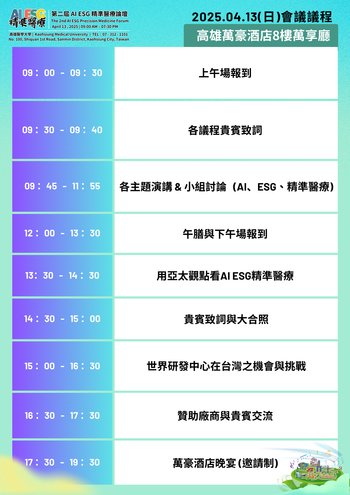 本大會論壇舉辦日期為2025年4月12日 - 2025年4月13日,4月12日於高雄醫學大學國際會議中心舉行,4月13日於高雄萬豪酒店舉行。