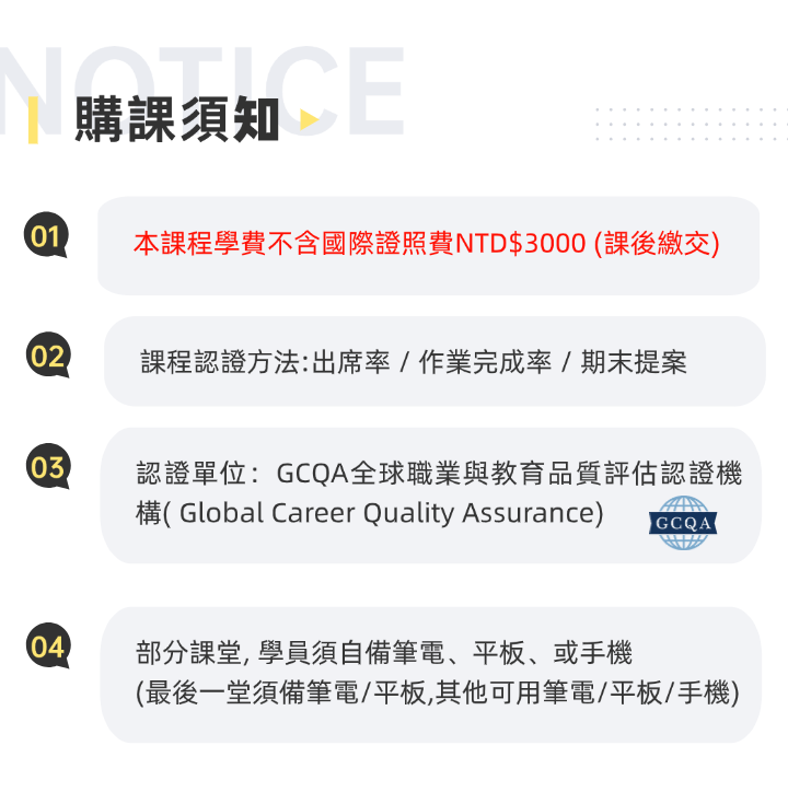 四、如因天災等不可抗力因素造成活動或培訓異動,本單位保留變更師資、培訓內容、時間及場地之權利。