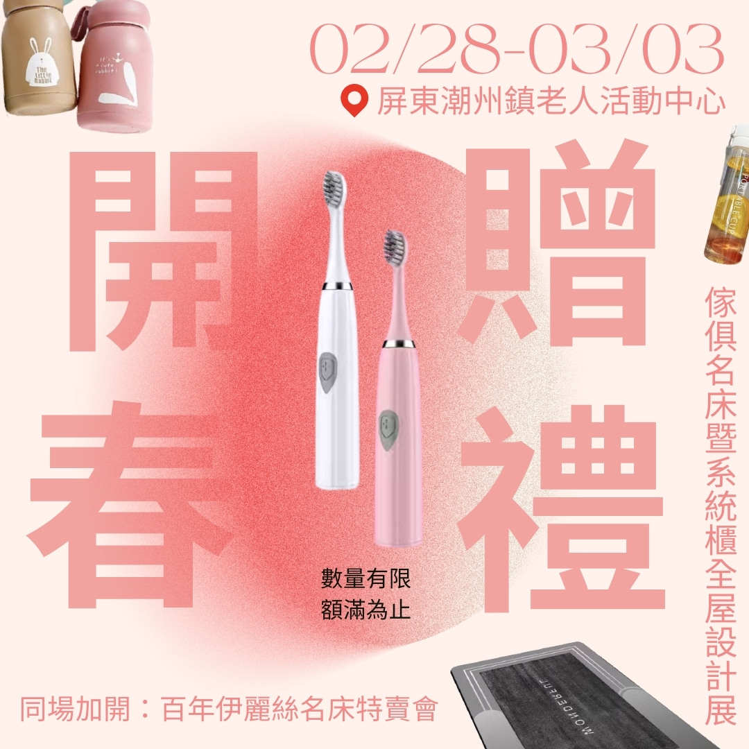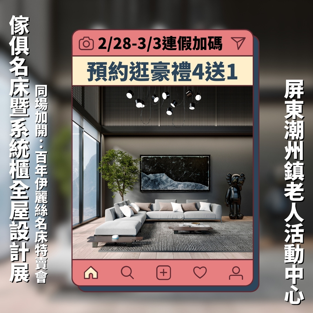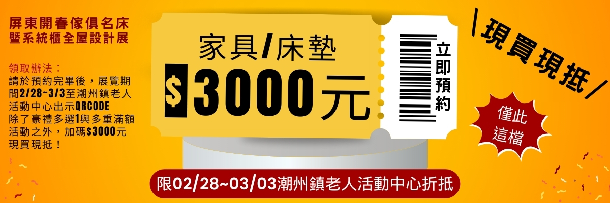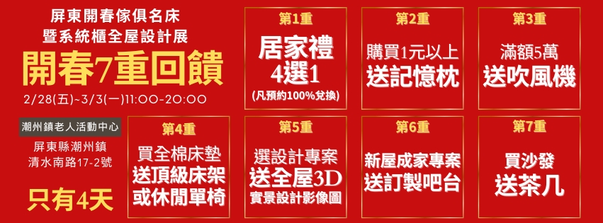 2025 屏東開春傢俱名床暨系統櫃全屋設計展 匯聚時下最流行的居家設計風格,結合國際級床墊品牌優惠,為台灣消費者帶來一場前所未有的家居體驗。我們誠摯邀請所有對居家生活充滿熱情的朋友,共同參與這場年度盛會,一同探索居家美學的無限可能!預約參觀加碼送以下豪禮4選1,每項禮品數量有限越早來優先選唷!