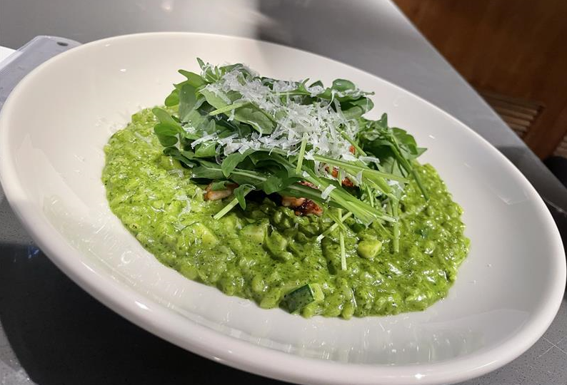 🥬青醬小卷燉飯🦑展現了地中海的鮮美風味。選用新鮮的小卷,搭配當季食材以羅勒、橄欖油及帕瑪森起司製成的青醬,融入細緻的義大利米中。米粒保持完美的口感,小卷鮮嫩多汁,每一口都能品嚐到海洋的鮮甜以及青醬的獨特香氣。