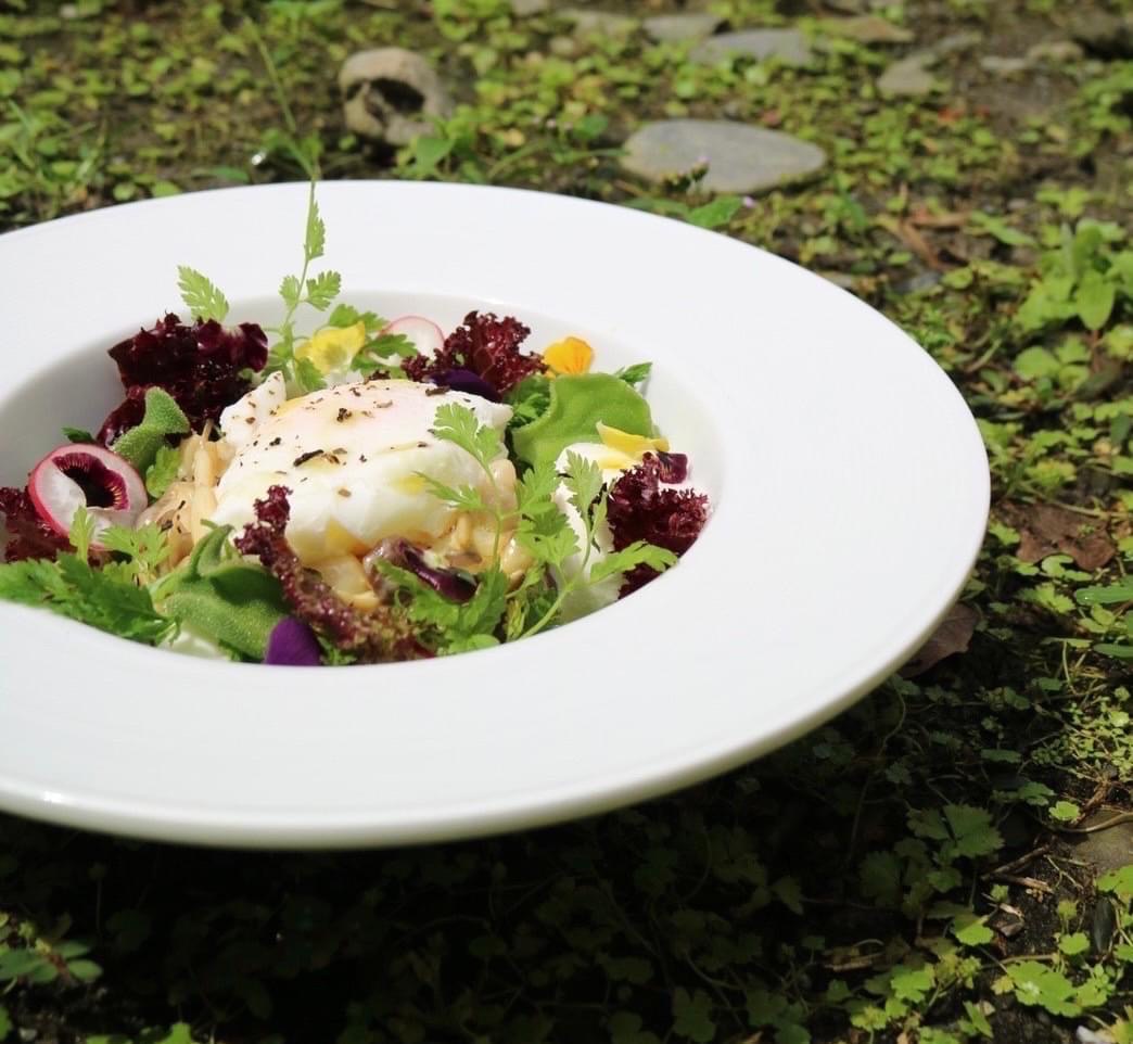 溫泉卡布里沙拉是一道義式風味的創意前菜。以水波蛋為主角🥚,蛋黃呈現完美的半熟狀態,搭配新鮮的小番茄、莫札瑞拉起司球,以及芝麻葉、紫包心等多種綜合生菜🍅。淋上特製醬汁,帶來清爽開胃的口感,做法看似很簡單,確也不容易,很期待主廚Kelvin會提供什麼樣新鮮的料理方式。