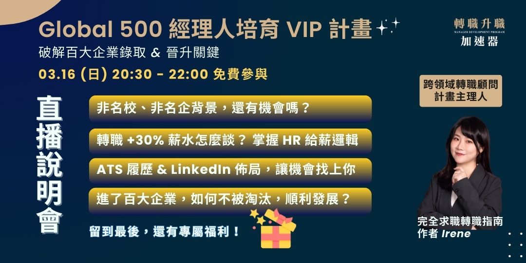 百大企業經理人培育計畫 Global 500 Manager Development Program 是一個實戰型轉職 + 職涯成長計畫,幫你快速找到方向、提升求職競爭力,拿下頂尖企業的工作機會,並且成為未來的經理候選人。這場說明會會告訴你如何做到!