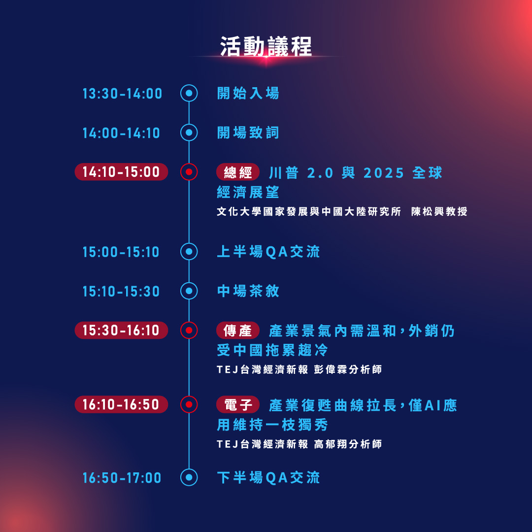 TEJ 2025年產業展望講座,由TEJ信評與產業研究團隊偕同總經專家,從AI、川普新政、中國低價競爭角度,與您一同探究面臨巨變的2025年,誠摯地邀請您蒞臨參與分享。