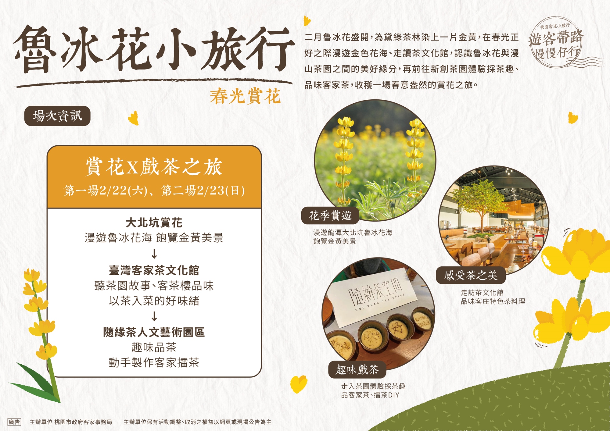 二月盛開魯冰花在龍潭的大北坑上盛開,為黛綠茶林染上一片金黃,魯冰花與漫山茶園之間的美好緣分,需要您一同來見證,上午在茶園欣賞魯冰花之美,再前往臺灣客家茶文化館,體驗製茶的樂趣,也透過深度探索認識茶產業的發展,與魯冰花之間微妙的關係。