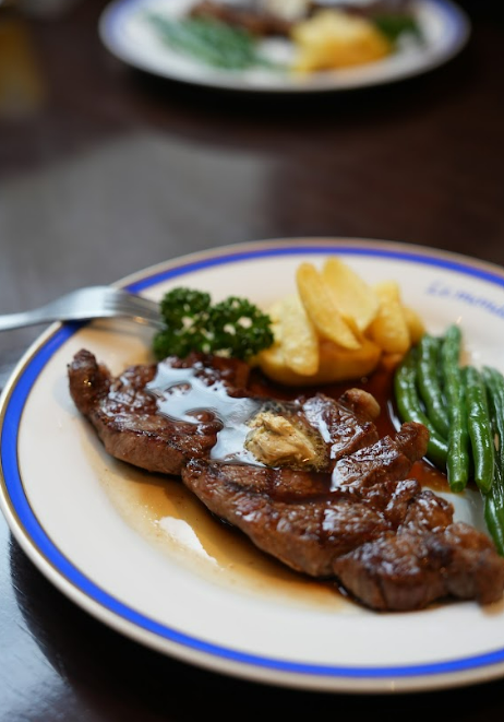 在昏黃燈光下的西餐廳,牛排端上桌,擺放在精美的古典瓷盤上,刀叉碰撞瓷器的聲音輕輕響起,像是一場老電影的序幕。肉汁豐盈,醬汁濃郁,搭配一旁的奶油馬鈴薯與綠色豆角,這是一場關於復古的儀式感,一場昭和紳士與淑女的餐桌對話。