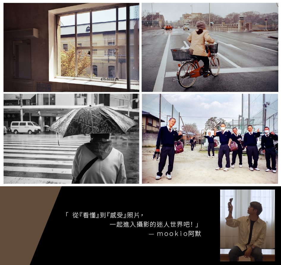 mookio阿默,出版七本攝影暢銷書:「GR極致的浪漫」誠品暢銷排行第一、「iPhone 輕觸的浪漫」台灣首本手機攝影書、「默拍京都」誠品職人大賞等,GR Photo Festival 攝影大賽評審、13年攝影教學經驗,擅長以生活美學出發,引導探索影像世界。
