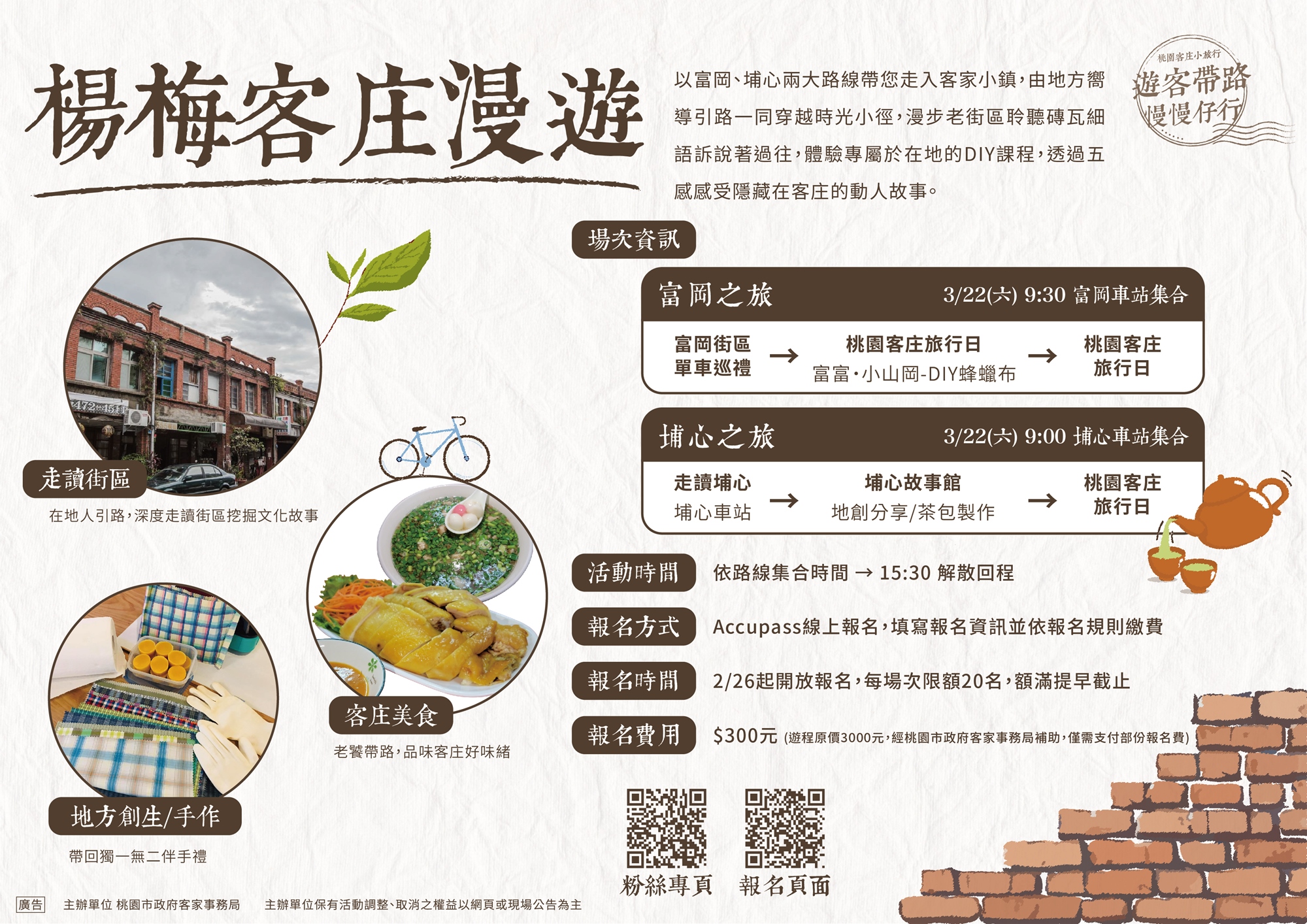 - 報名費用:$300元(遊程原價3000元,經桃園市政府客家事務局補助,僅需支付部份報名費)