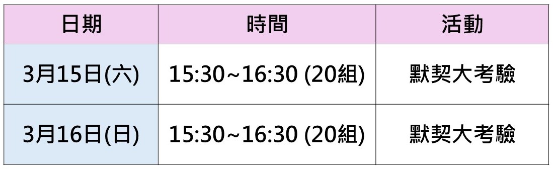 活動時間 :2025年3月15日(六) 15:30~16:30、3月16日(日) 15:30~16:30