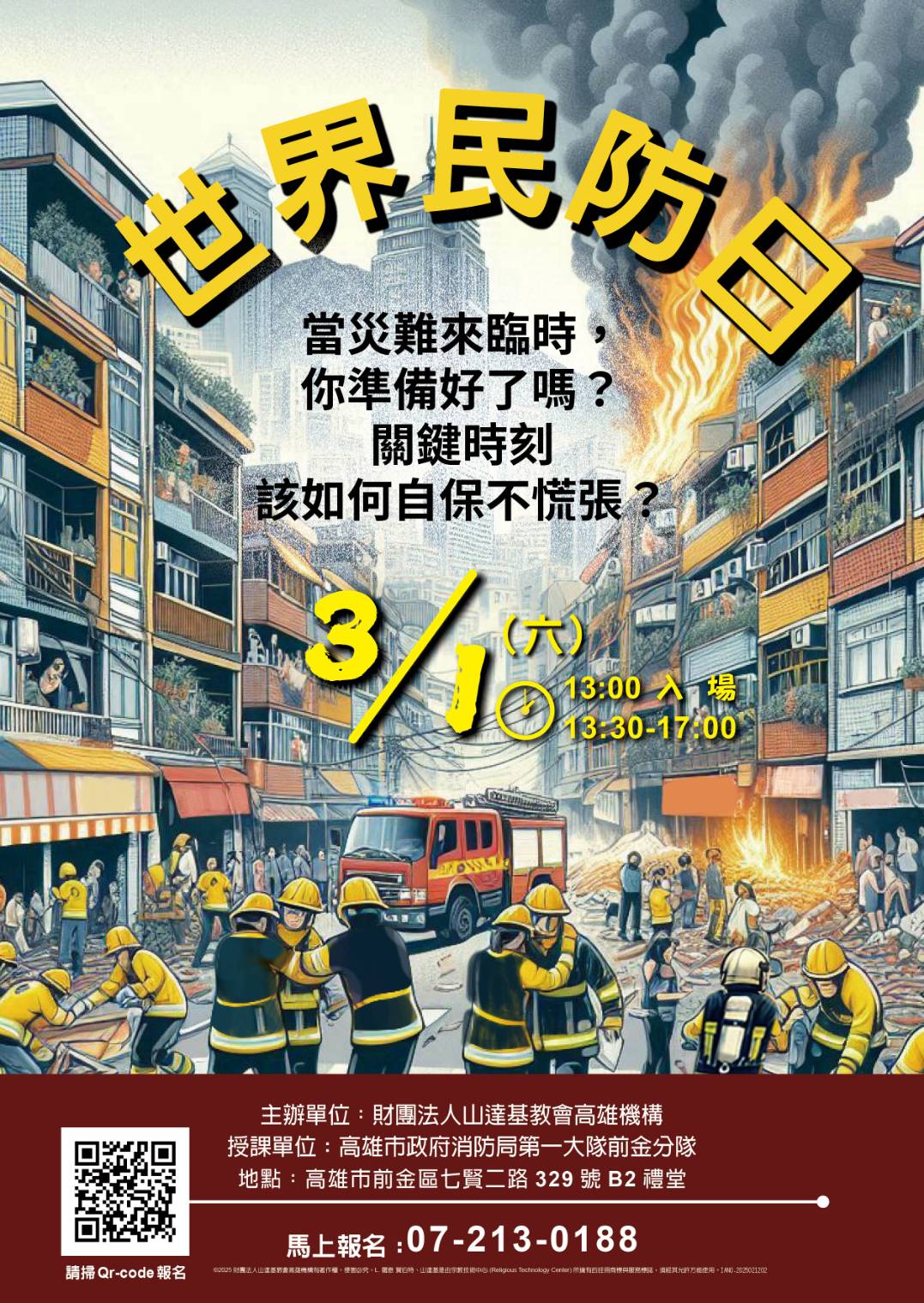 🚨 當災難來臨時,你準備好了嗎?🔥 如何在關鍵時刻保持冷靜、自救不慌張? 來學習實用的防災知識與應變技巧,讓你在危急時刻冷靜應對、保護自己與家人! 💪🏼💪🏼🎯 防災講座資訊日 期|📅 2025 年 3 月 1 日(六)時 間|🕝 13:30 - 17:00(13:00開放入場)地 點|📍 高雄市前金區七賢二路329號B2禮堂授課單位|👨🚒 高雄市政府消防局第一大隊前金分隊主辦單位|🏢 財團法人山達基教會高雄機構