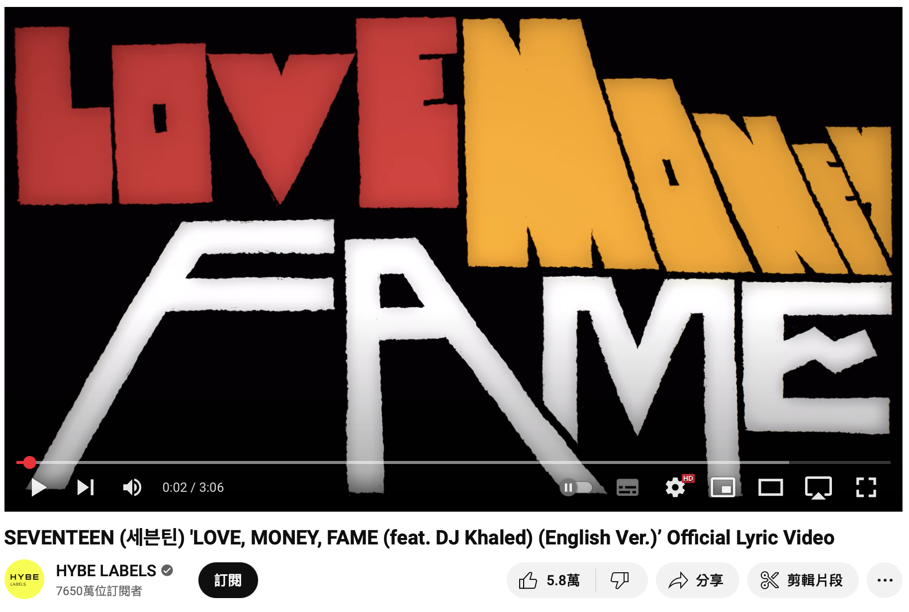 〈LOVE, MONEY, FAME〉由韓國超人氣男團SEVENTEEN和美國大咖 DJ 兼音樂製作人 DJ卡利(DJ Khaled)合作。卡利音樂生涯中獲獎無數,其中憑藉 2019 年專輯《Father of Asahd》奪得第 62 屆葛萊美獎,其它專輯也多次入圍葛萊美獎提名。結合了Hip hop 與R&B的風格,舒服的旋律非常洗腦。