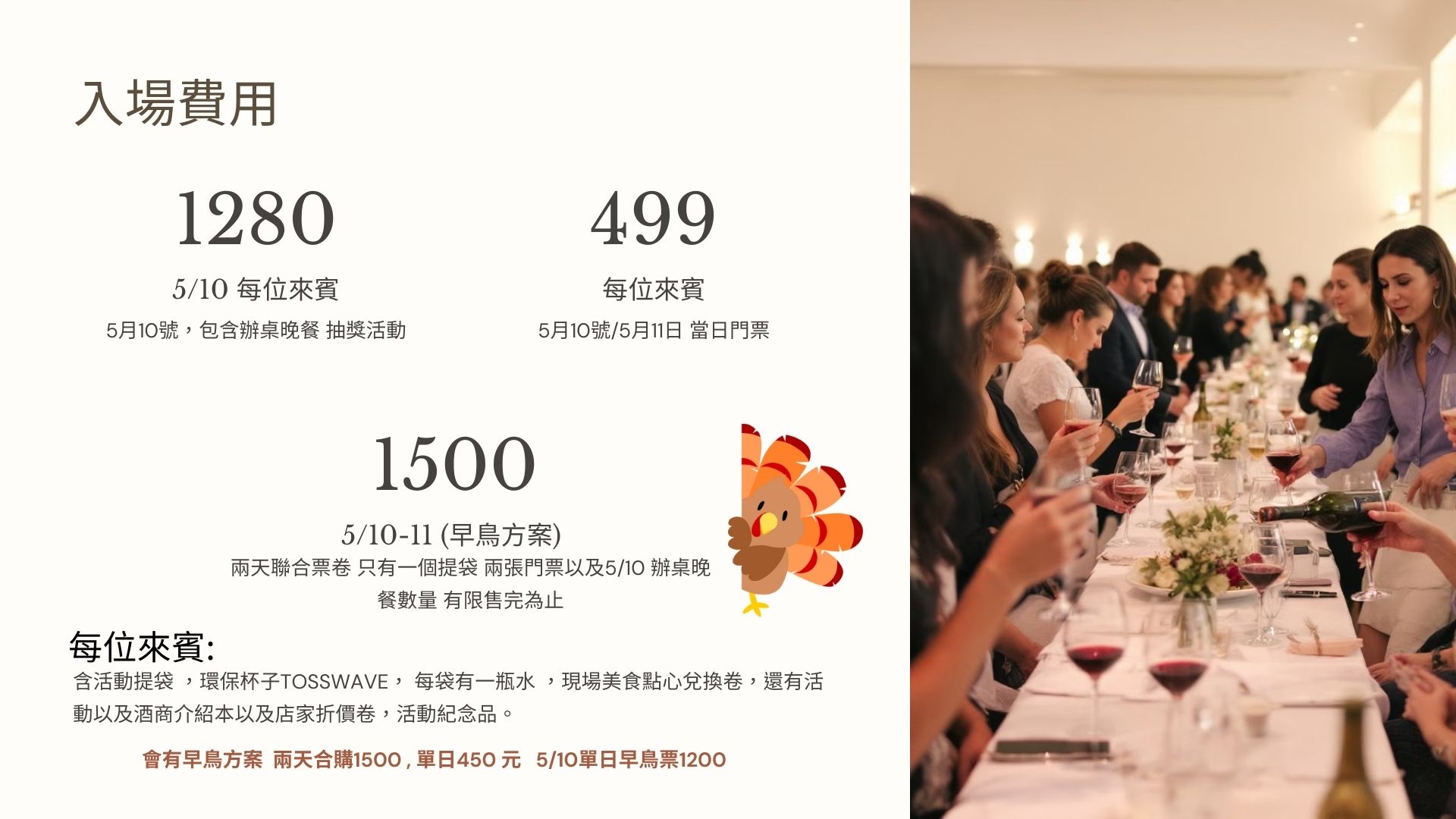 - 雙日門票:1500元 含5/10 晚餐 跟5/11 日門票