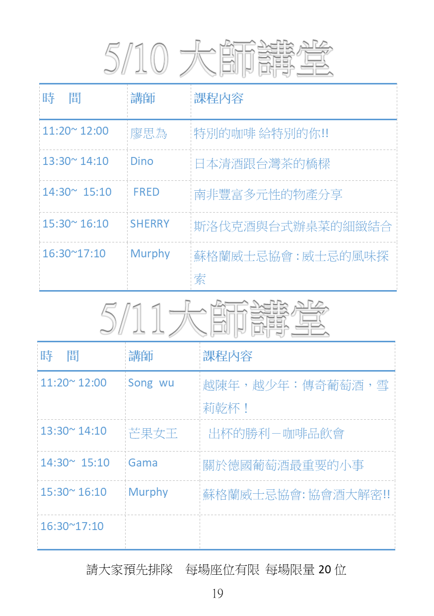 - 為避免影響他人品飲感官,活動當日請勿噴灑香水或有味道之髮妝用品。