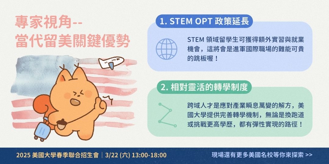 - 主題講座:包含花費總覽、選校指南、OPT工作簽證等分享