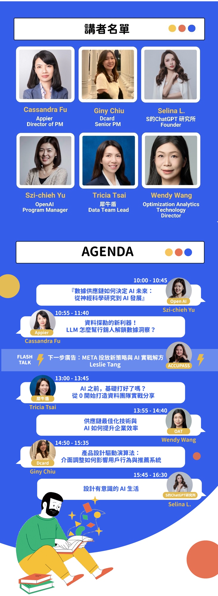 本次將邀請多位在臺灣從事資料科學相關工作或研究的女性專業人士,透過實際產業案例,分享她們如何運用大數據與 AI 技術,為企業及社會帶來創新價值。無論是製造、零售、金融、教育、醫療或新創服務,都有機會在這場論壇中獲得啟發,親身感受 AI 與數據科學在真實場景中激盪出的無限可能。