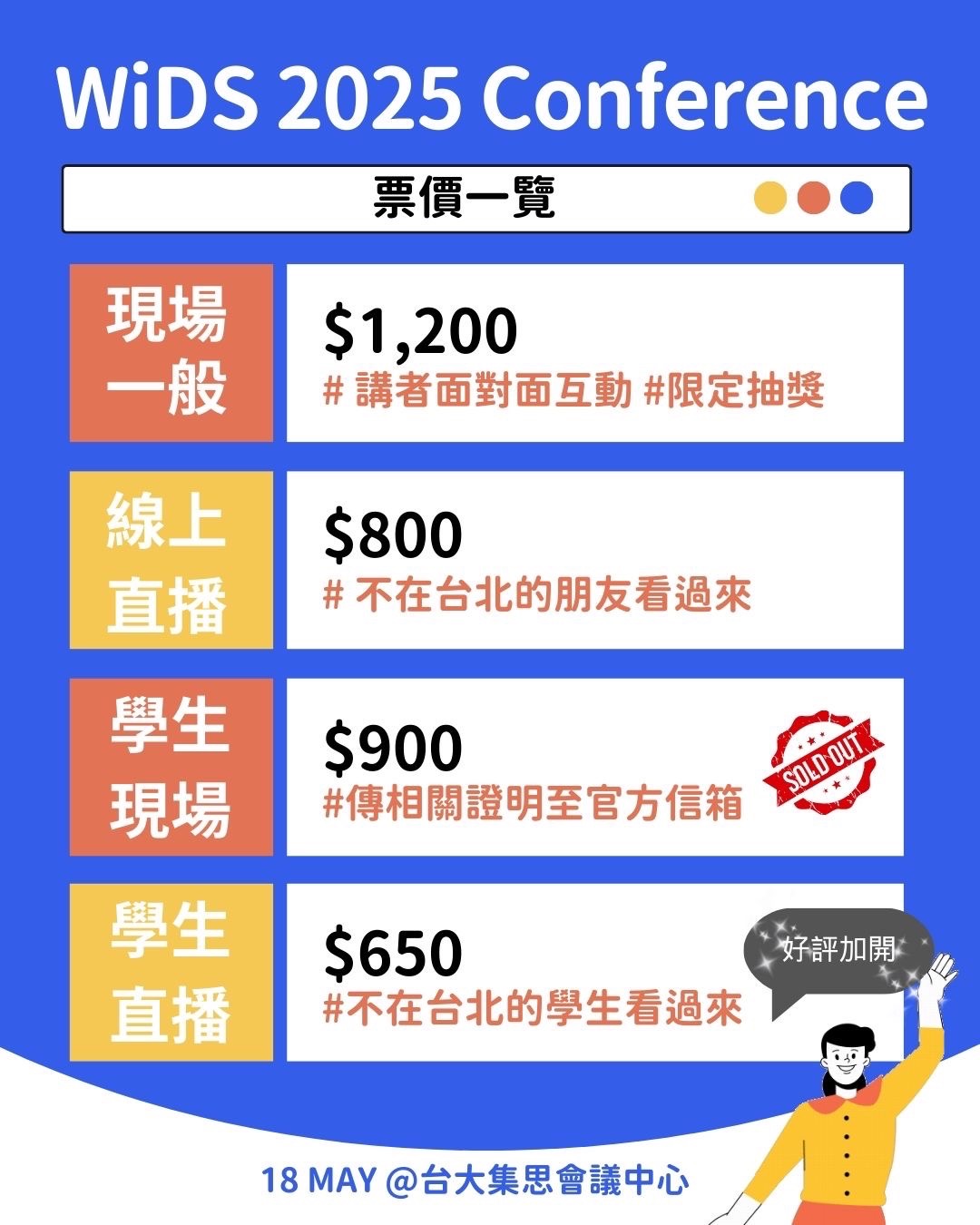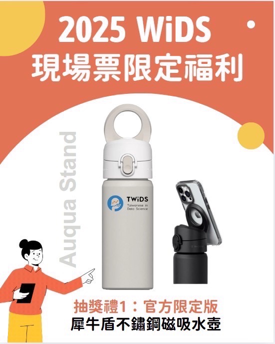 - 請注意線上票券與現場票券不得交互並用!請注意,本活動售出的線上票券與現場票券不得交互並用。如果您購買線上票券,請務必透過線上直播參與會議,不可更換成現場票券。同樣地,如果您購買現場票券,請您於現場參加會議,若購票後因不可抗力因素,無法至現場參與,請發送電子郵件至twidatascience@gmail.com或私訊臉書粉絲專頁,由專人為您服務。感謝您的配合!