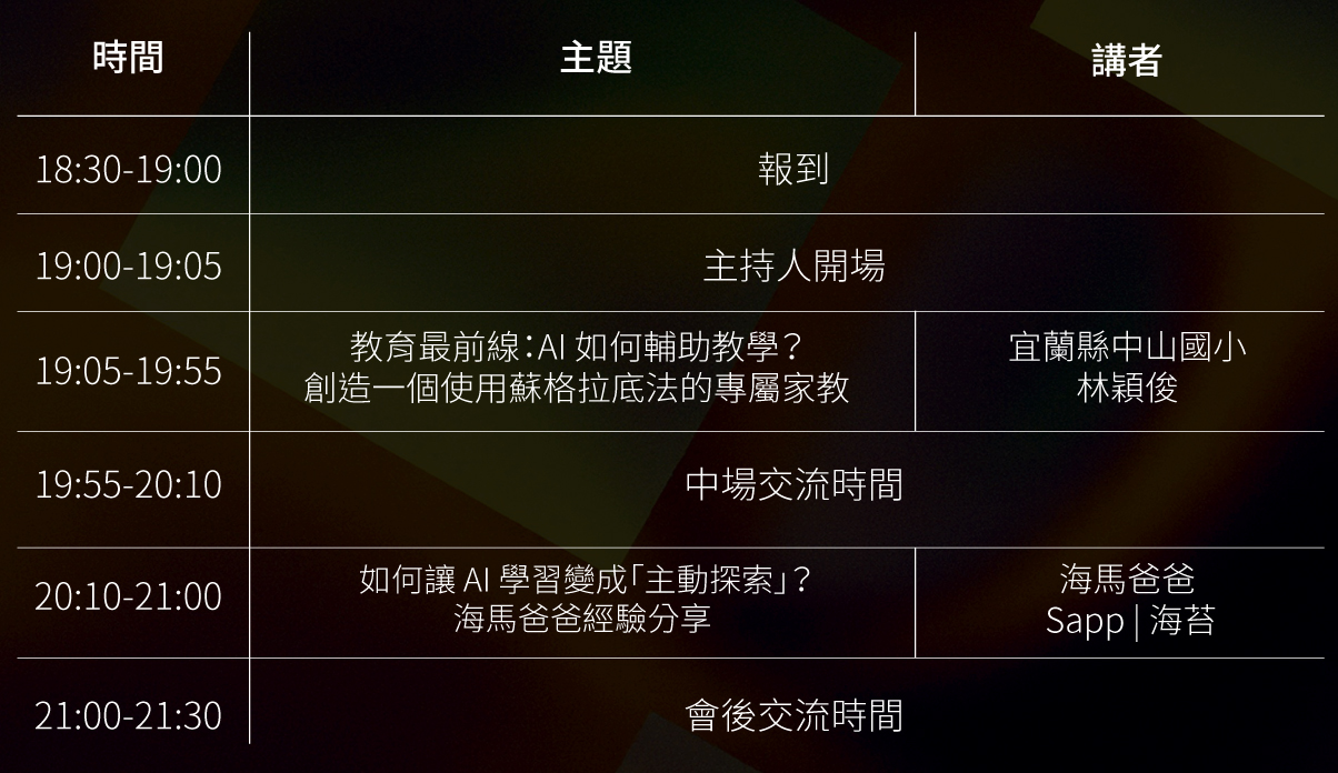 活動時間:19:00 - 21:00(18:30 現場開放報到)