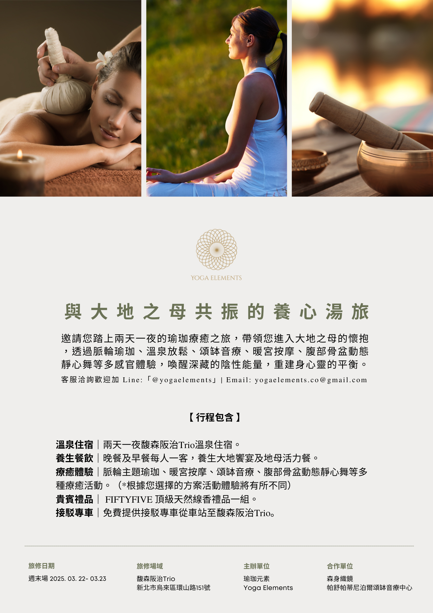 瑜珈元素 X 馥森阪治(限量週末場)|與大地之母共振的養心湯旅