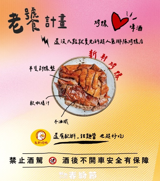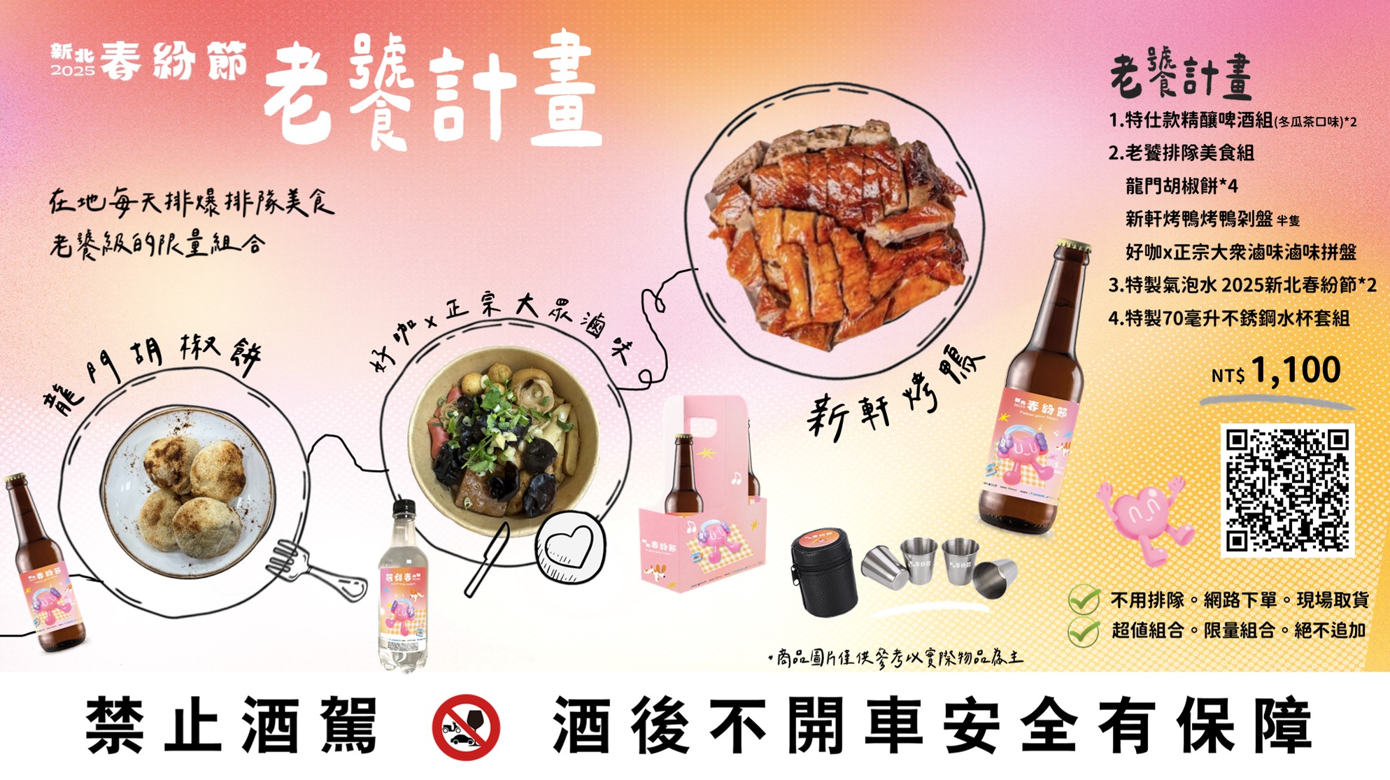 這次的餐酒美食套組結合新北在地人氣排隊美食與創意特仕款飲品,包括皮脆肉超軟嫩的「新軒烤鴨」;深受在地人喜愛的「好咖x正宗大眾滷味」;以及皮薄酥脆、肉汁飽滿的「龍門胡椒餅」。除此之外,還有與三重在地業者啤酒頭釀造合作推出的特仕款冬瓜茶口味精釀啤酒,預購隨贈2025新北春紛節周邊限量商品-特製紀念氣泡水與不銹鋼水杯套組,讓參與者不僅能品味道地美食,也能帶回專屬的節慶紀念品。