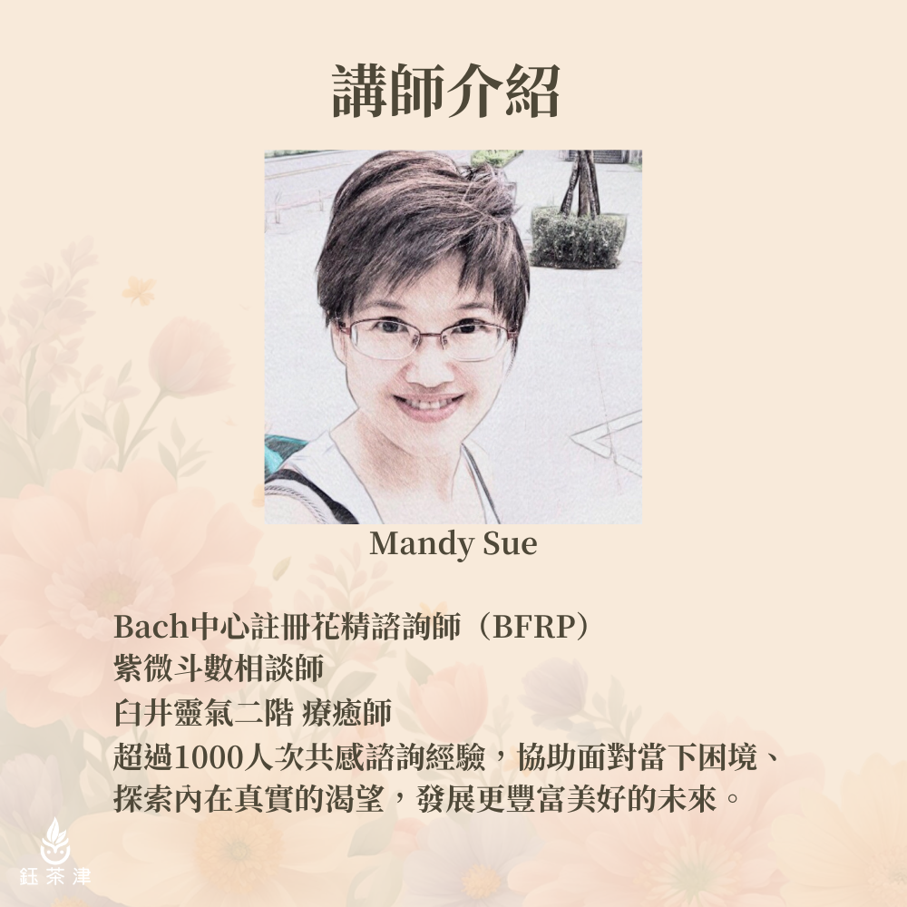 互動分享:與志同道合的夥伴分享感受,在交流中獲得更多啟發與支持。一起在茶香與花精的陪伴下,找回內在的安定與力量,讓心靈回歸最自在的狀態!