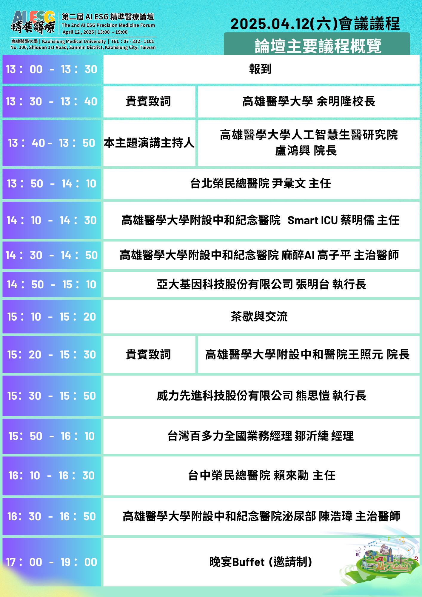 本大會論壇舉辦日期為2025年4月12日 - 2025年4月13日,4月12日於高雄醫學大學國際會議中心舉行,4月13日於高雄萬豪酒店舉行。