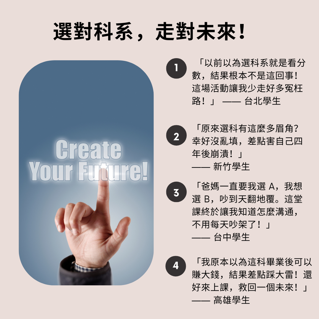未來選擇指南:科系×職涯×親子溝通 2月 26日 (星期三) · 下午8:00 - 9:30 時區:Asia/Taipei Google Meet 會議參加資訊 視訊通話連結:https://meet.google.com/byg-iwnm-zwp