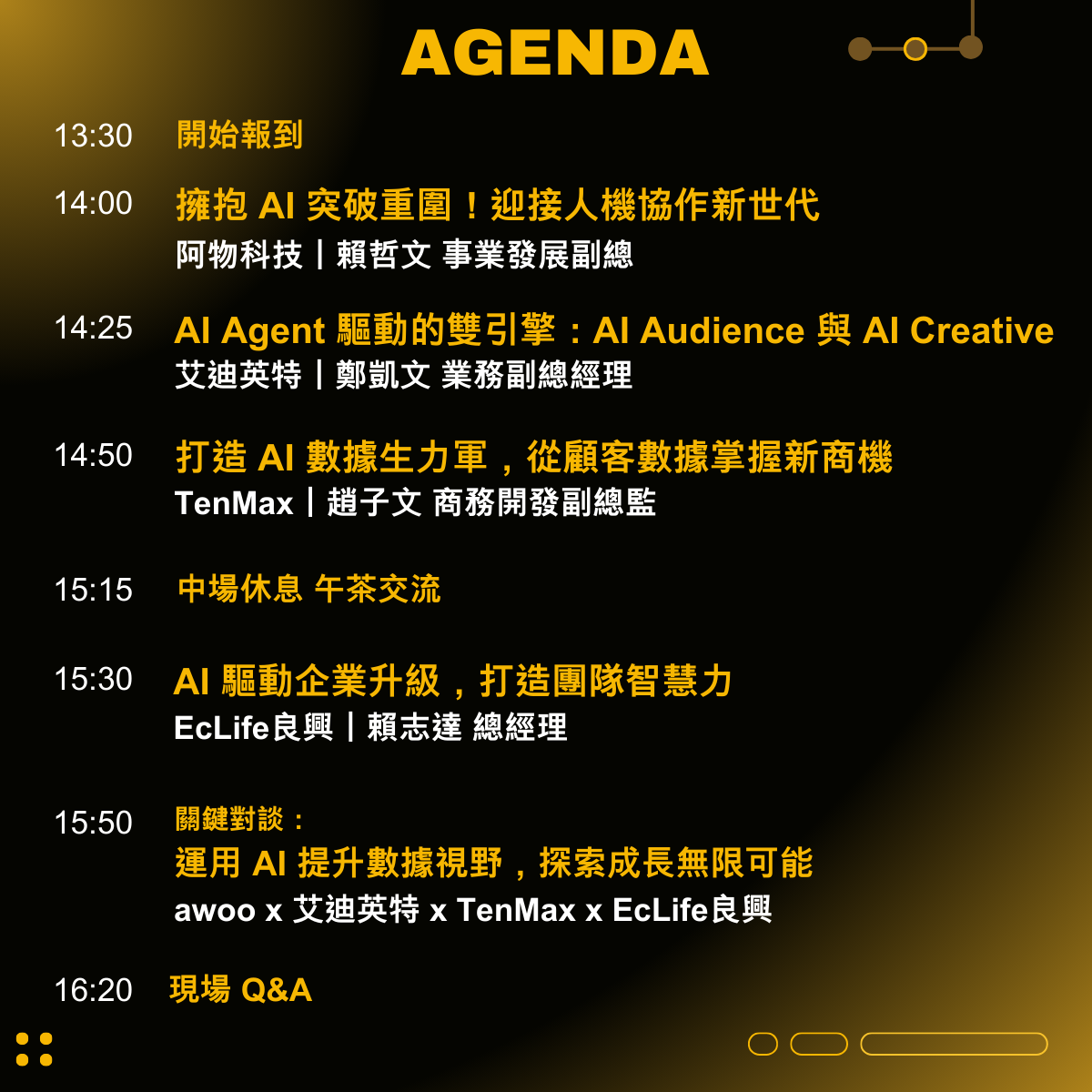 本次論壇將深入剖析 AI 技術如何將零散的數據,整合為品牌成長的強大動力,協助品牌精準洞察消費者的深層需求,實現人工智慧驅動之個人化行銷模式。並且透過創新思維結合實戰案例,探索 AI 與數據落地應用的最佳實踐,激發更多成長可能性!讓我們在科技驅動的市場中,一同邁向人機協作 2.0 的嶄新未來!
