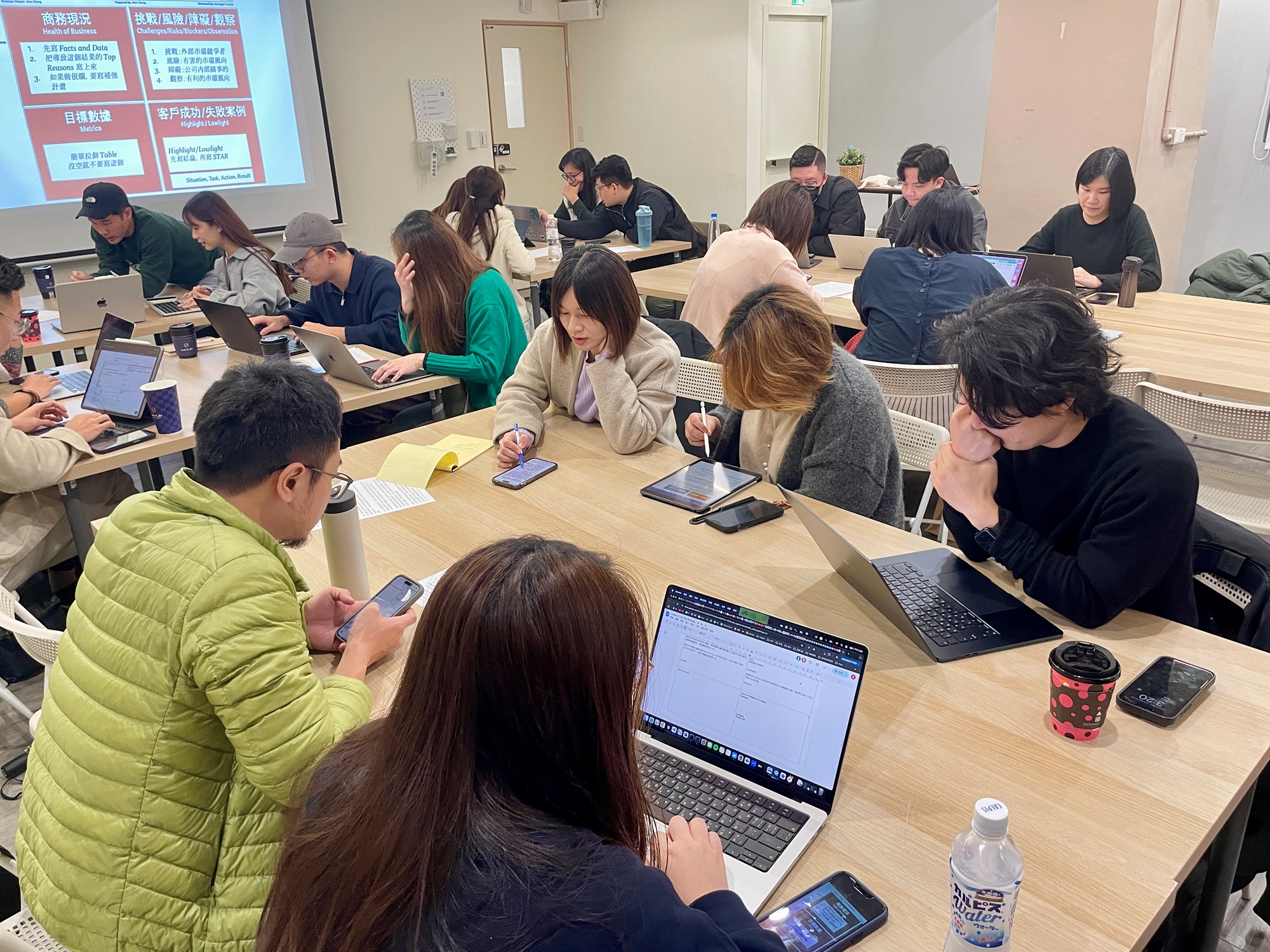 學員分組討論拆解商業案例與撰寫文件,由 Alex 提供專業建議協助優化內容