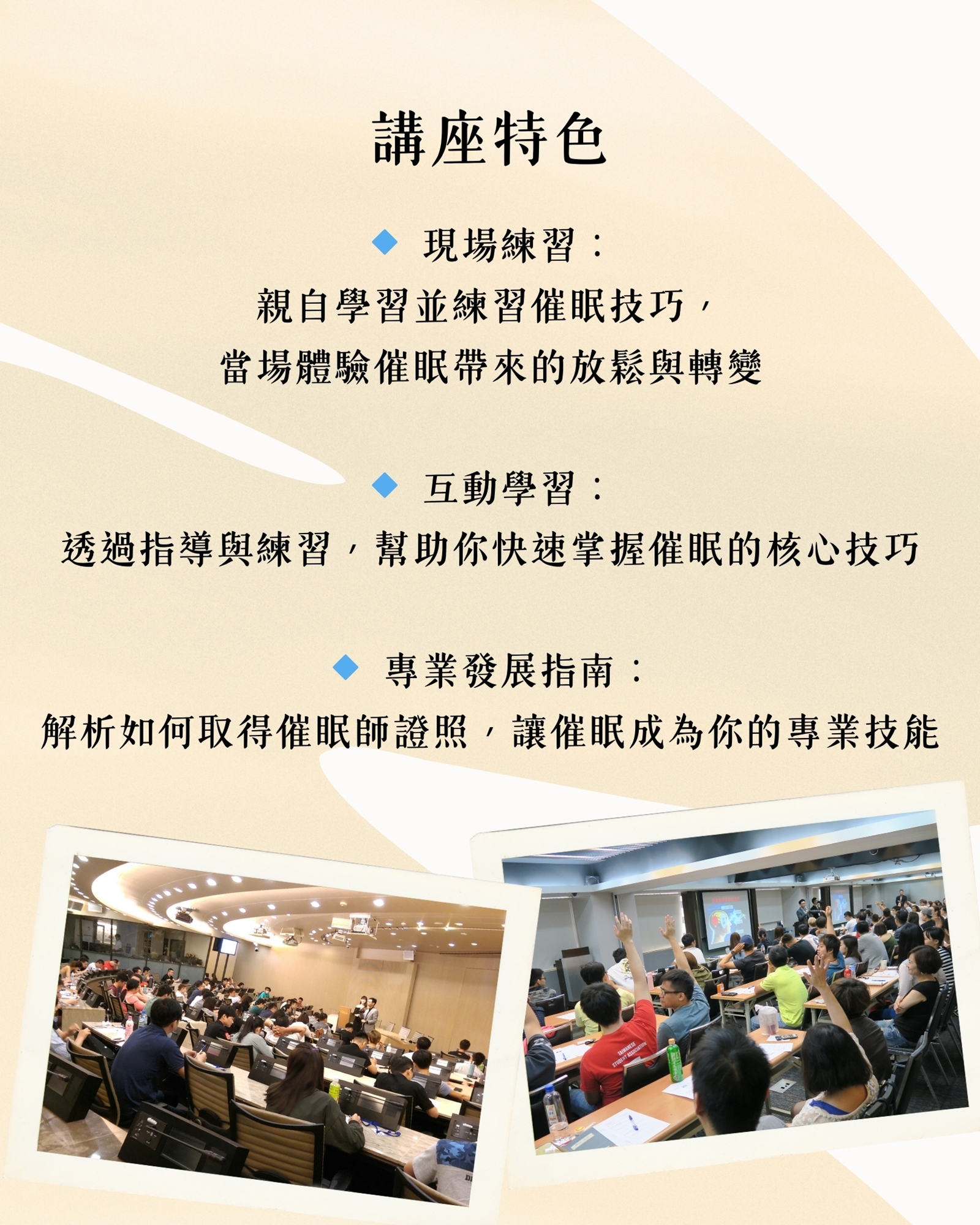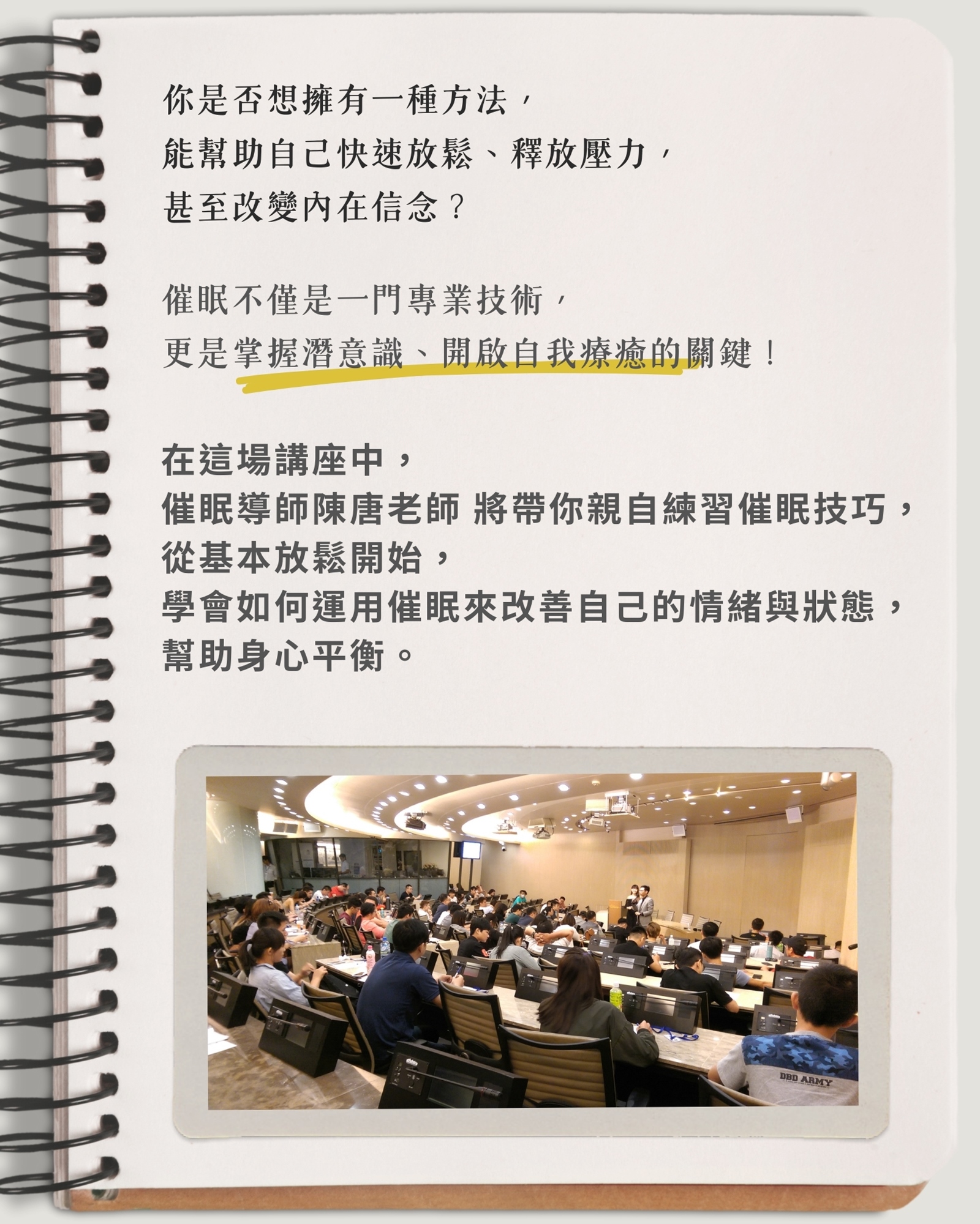 親自學習並練習催眠技巧,當場體驗催眠帶來的放鬆與轉變