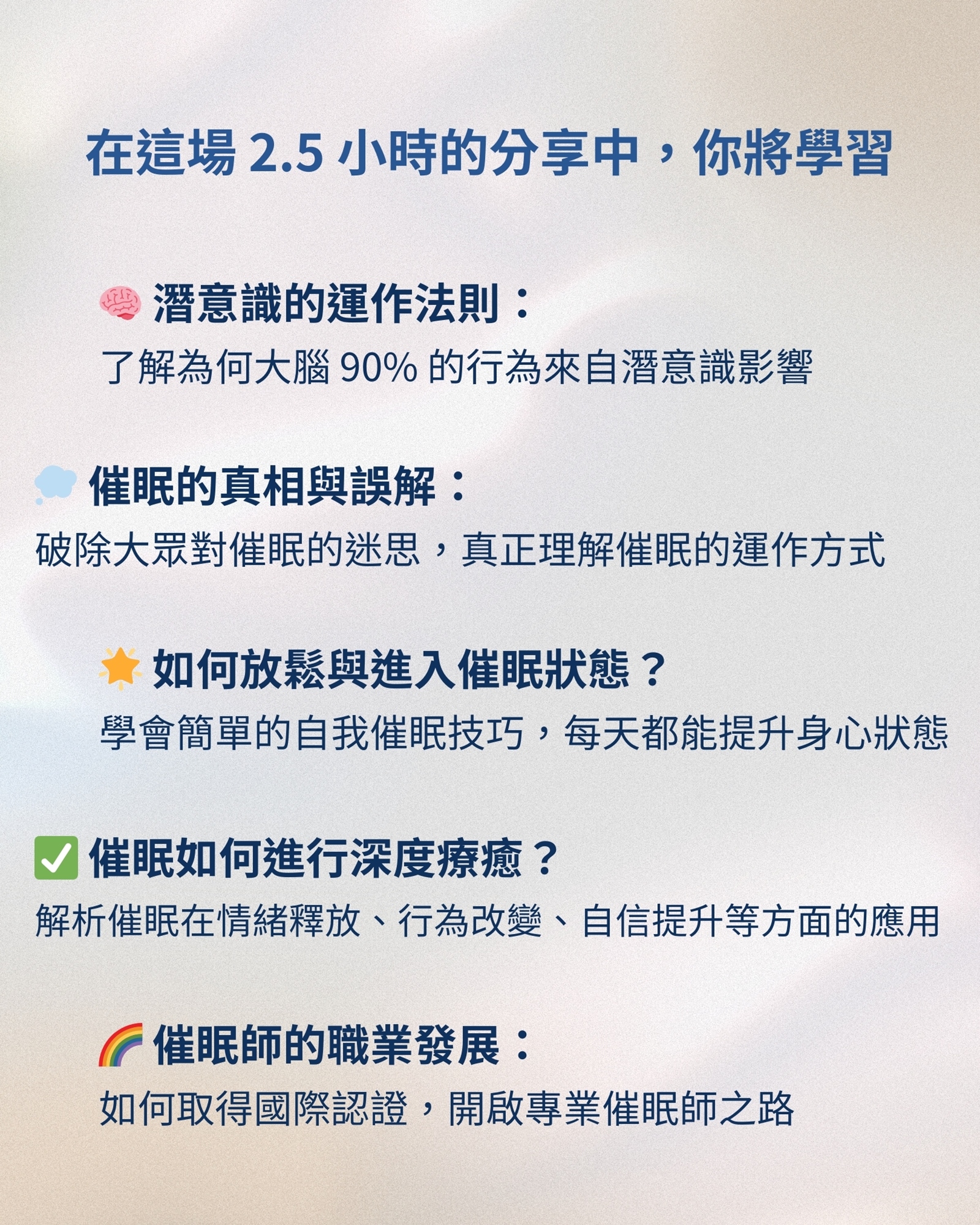 催眠不僅是一門專業技術,更是掌握潛意識、開啟自我療癒的關鍵!