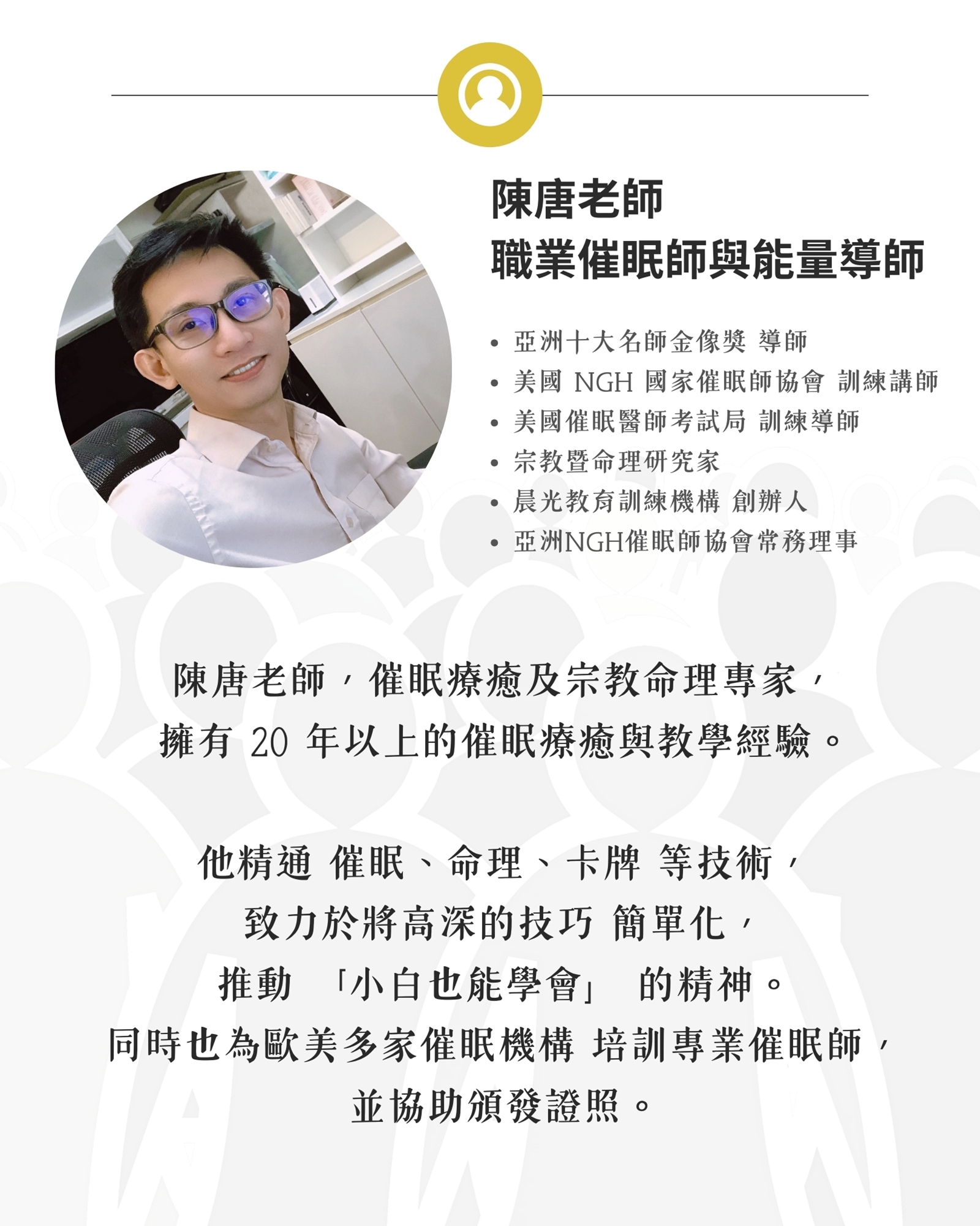 陳唐老師,催眠療癒及宗教命理專家,擁有 20 年以上的催眠療癒與教學經驗。
