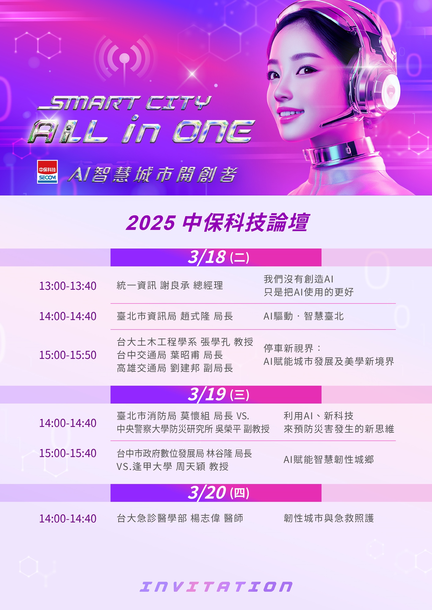 而中保科技論壇更邀請到各大政府、產業界長官精彩對談,引導您迅速瞭解2025年安防、資訊安全、防災和智慧醫療的最新發展趨勢和應用,場次資訊請參考下圖。
