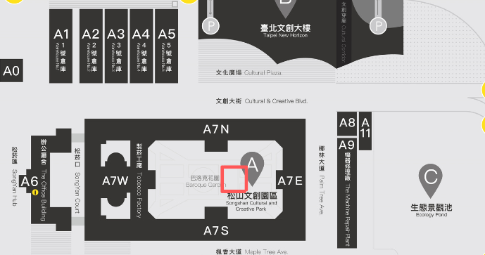 3.沿光復南路步行至松菸大道右轉進入園區,步行約100公尺即可抵達松山文創園區,全程約350公尺。